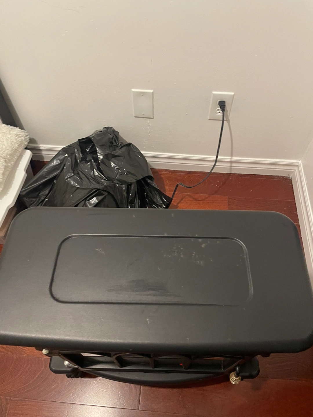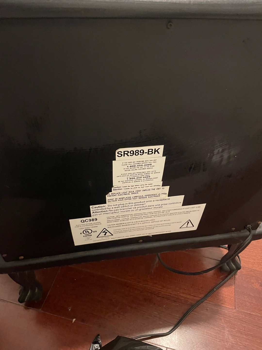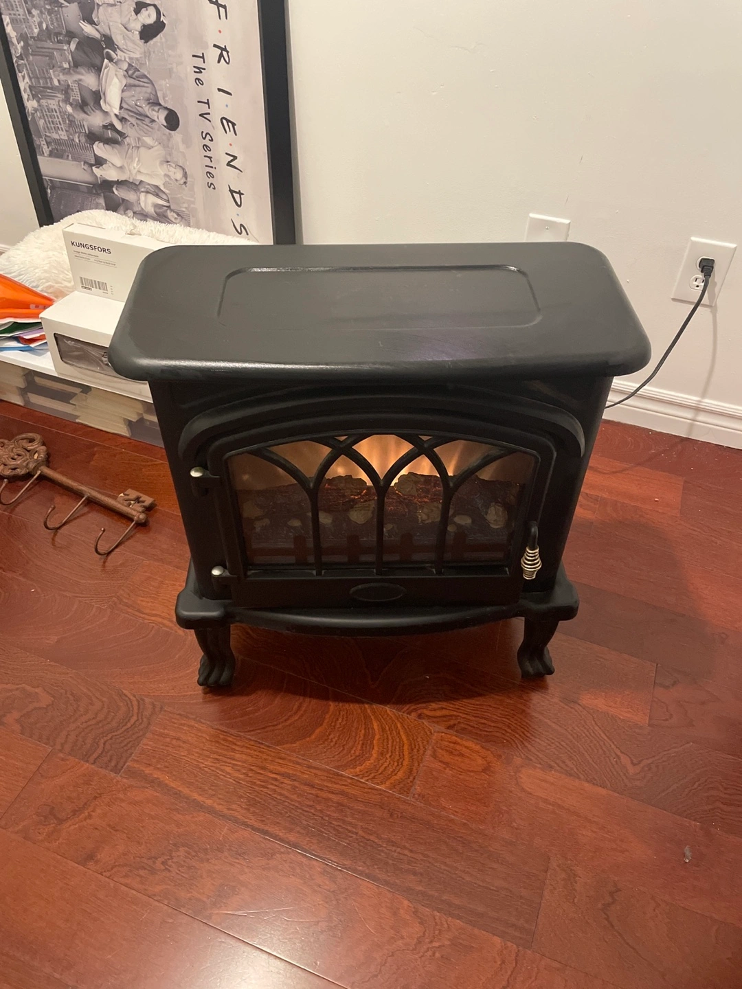 Black electric fireplace, with realistic flame effect. Has multiple heat settings and a timer function.Great condition