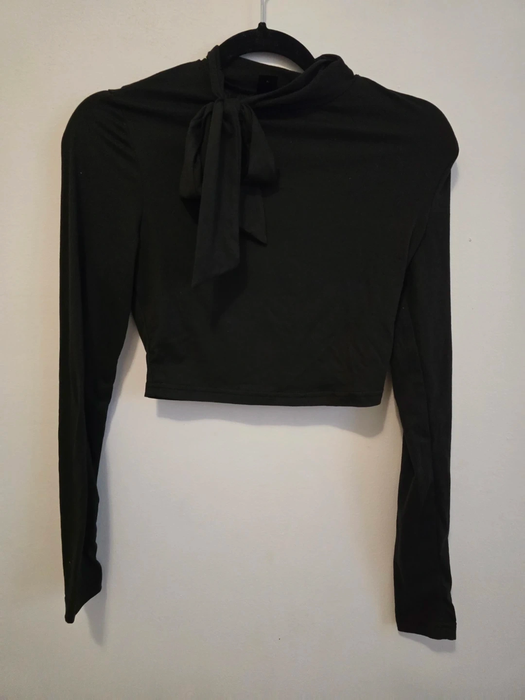 This black long sleeve crop top features a mock neckline with a bow detail. It's made of a stretchy material for a comfortable fit. Its cropped silhouette makes it a versatile layering piece.