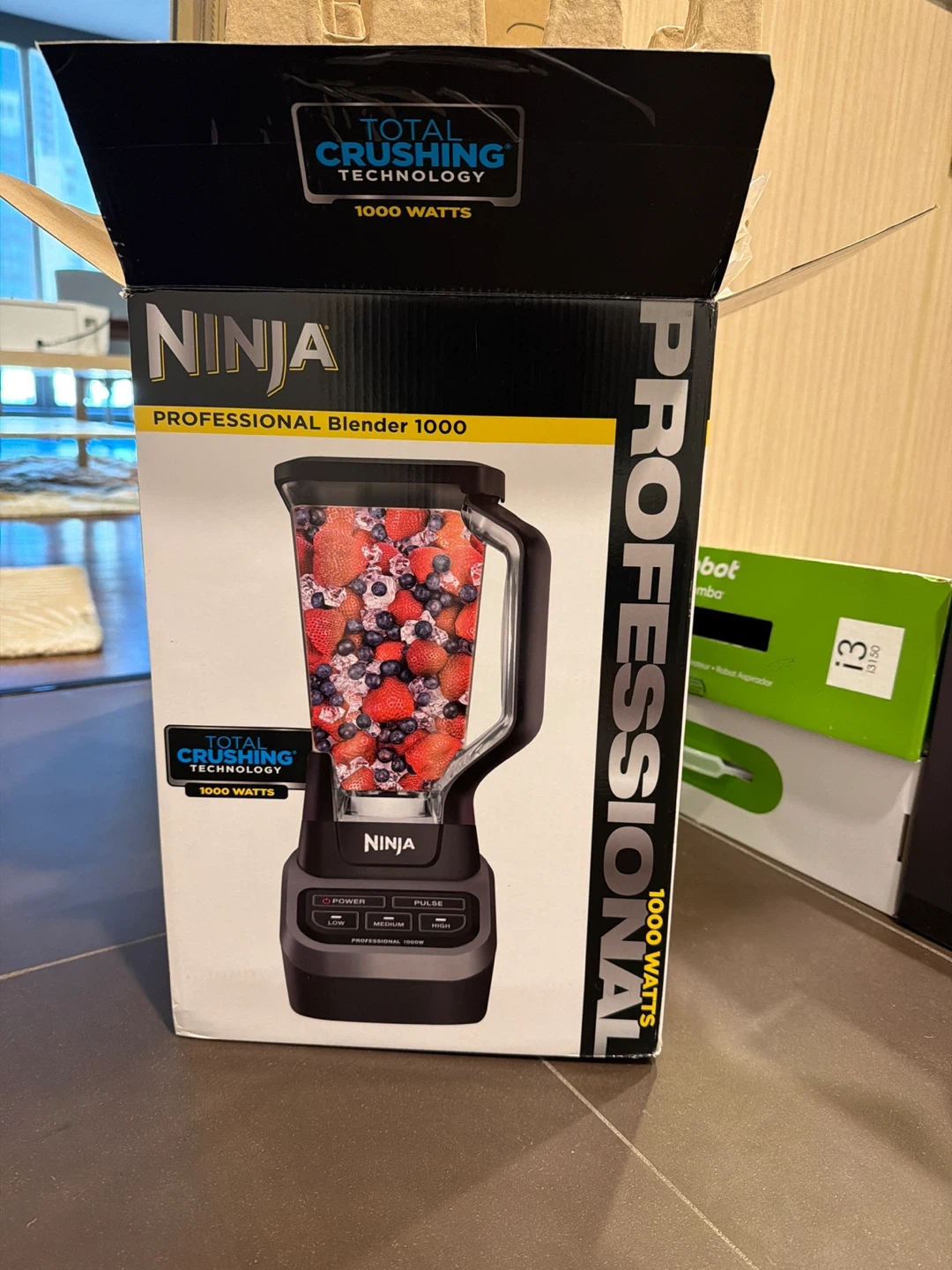 This is a Ninja Professional Blender 1000. It features Total Crushing Technology and 1000 watts of power. It has low, medium, and high speed settings, plus a pulse function. Comes complete with box.