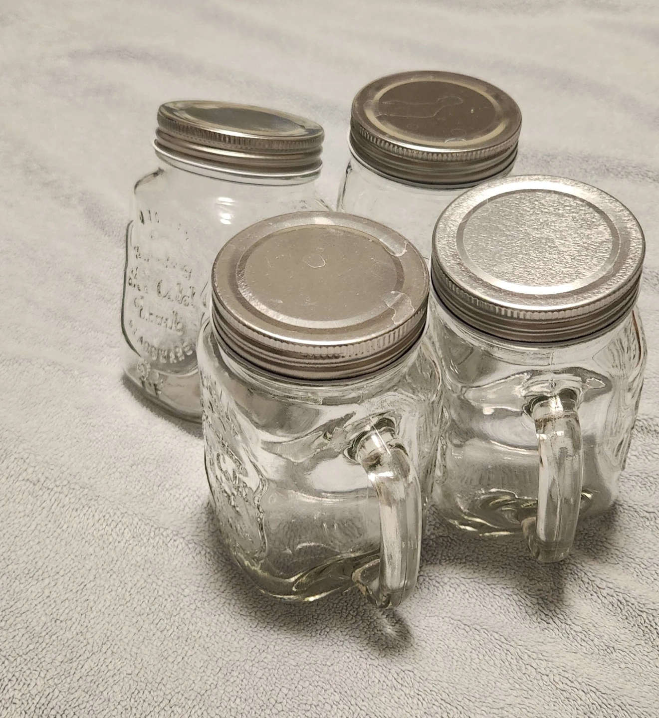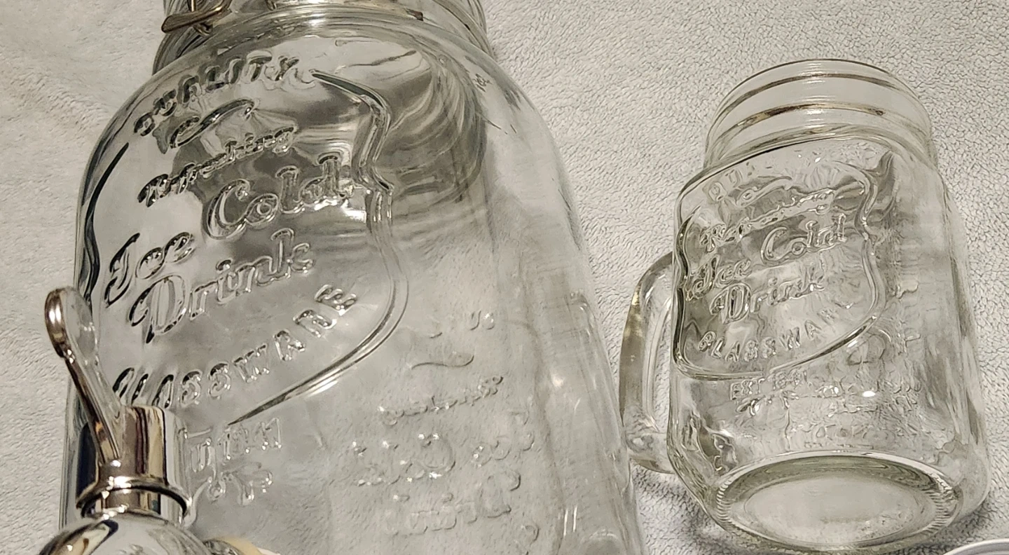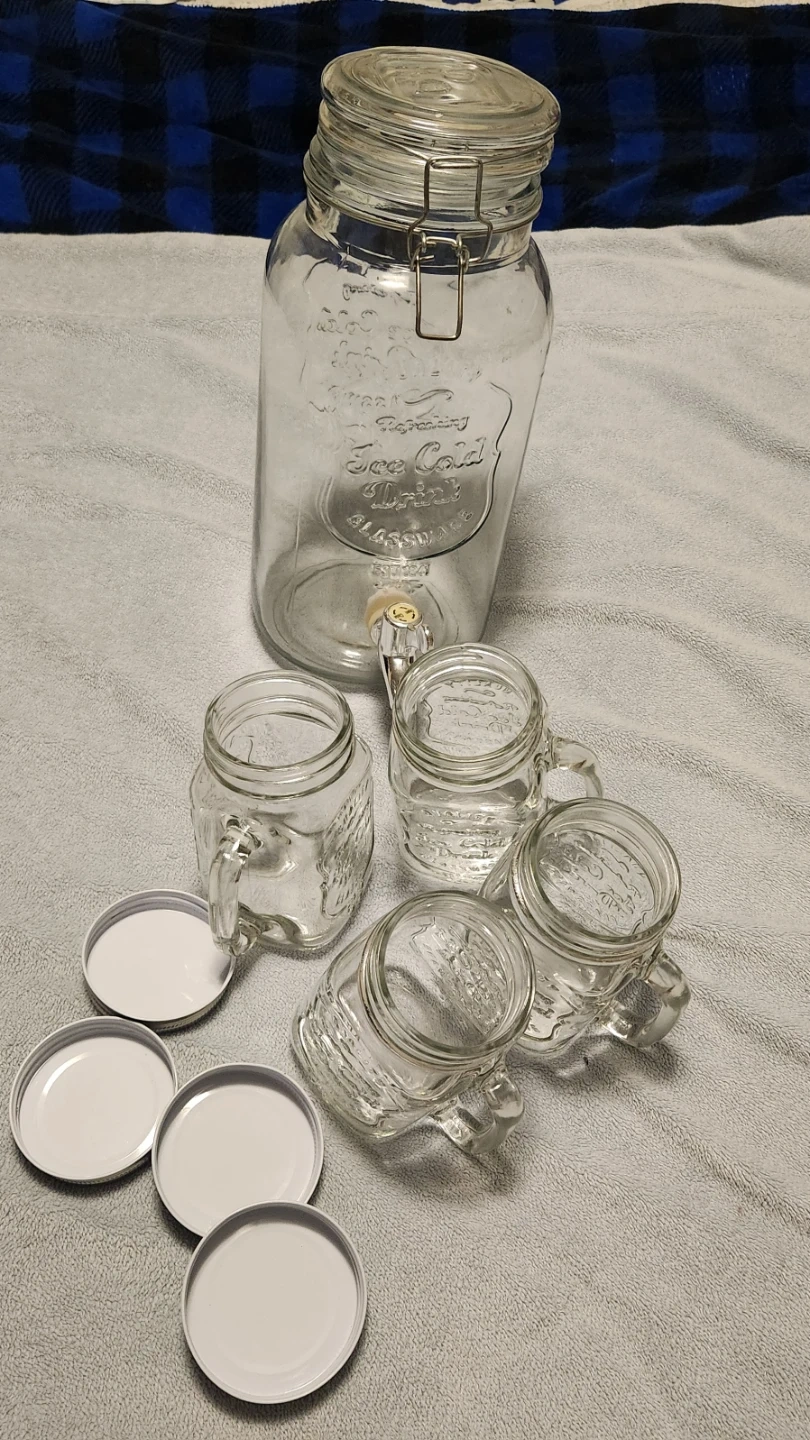 This set includes a large glass drink dispenser with a spigot holds 16 cups of beverage. Also has four matching mason jars mugs with lids. It's perfect for serving beverages at gatherings. No damage of any kind to lids, no crack or chips. Practically brand new.