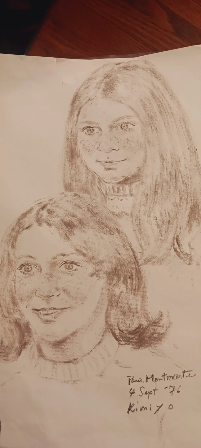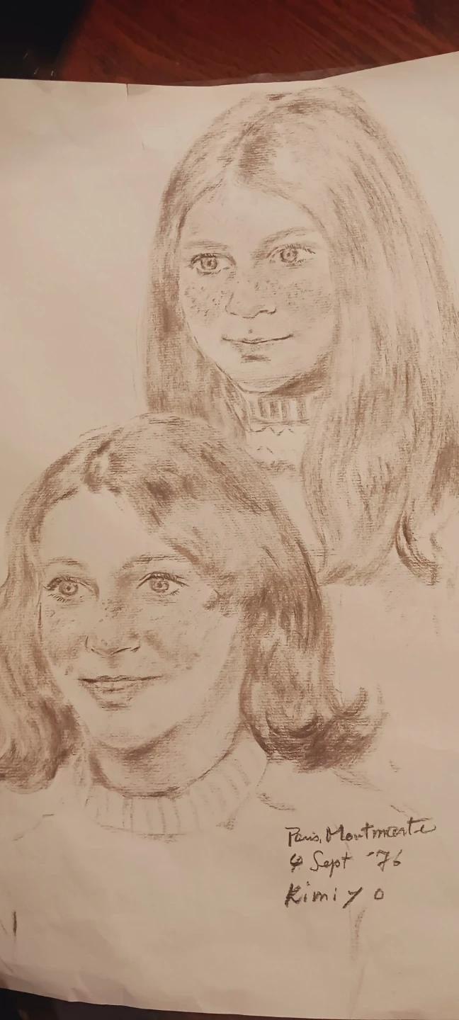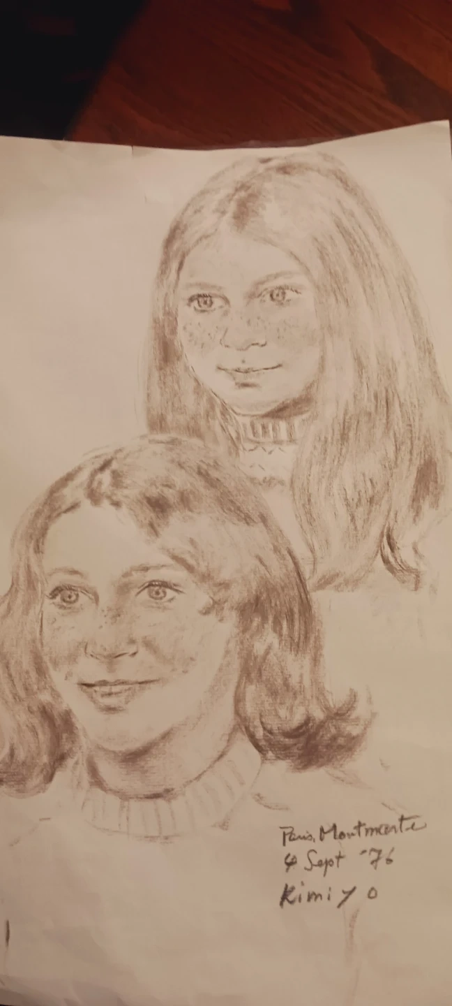 Vintage Pencil Sketch of Two Young Girls, Paris 1976.