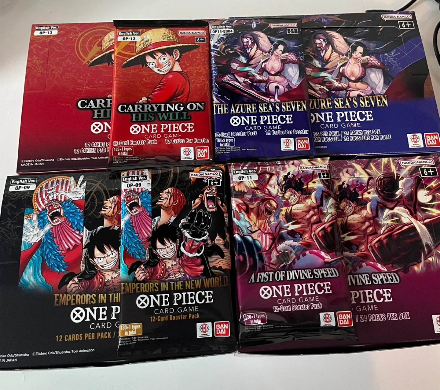 Bandai Namco One Piece card game booster packs. Includes sets OP-13, OP-14-EB04, OP-09, and OP-11. Most packs contain 12 cards, with some boxes having 24 packs. Brand new