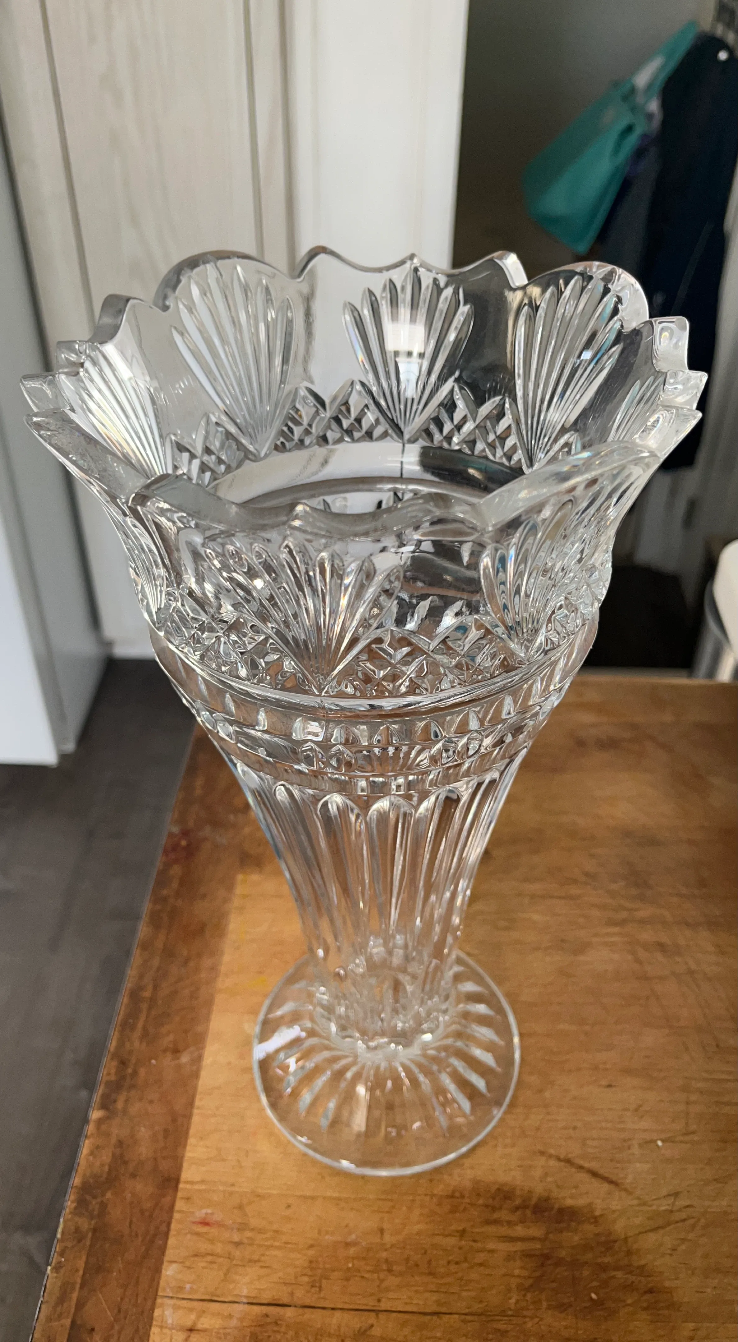 This is a beautiful crystal cut glass vase. It features intricate fan and diamond patterns throughout its design. The scalloped rim adds an elegant touch to its overall appearance. This vase is perfect for displaying flowers or as a decorative piece on its own!
