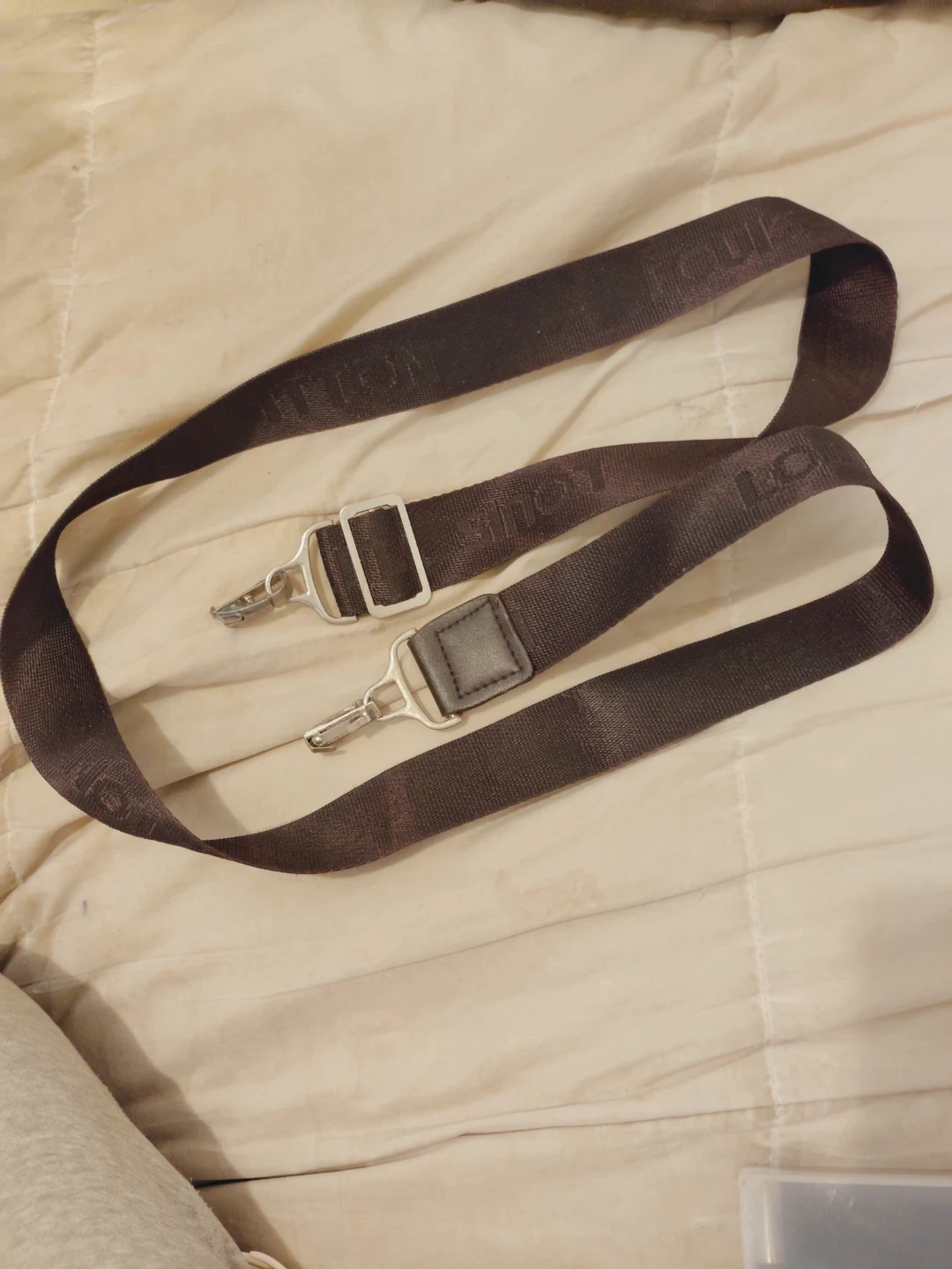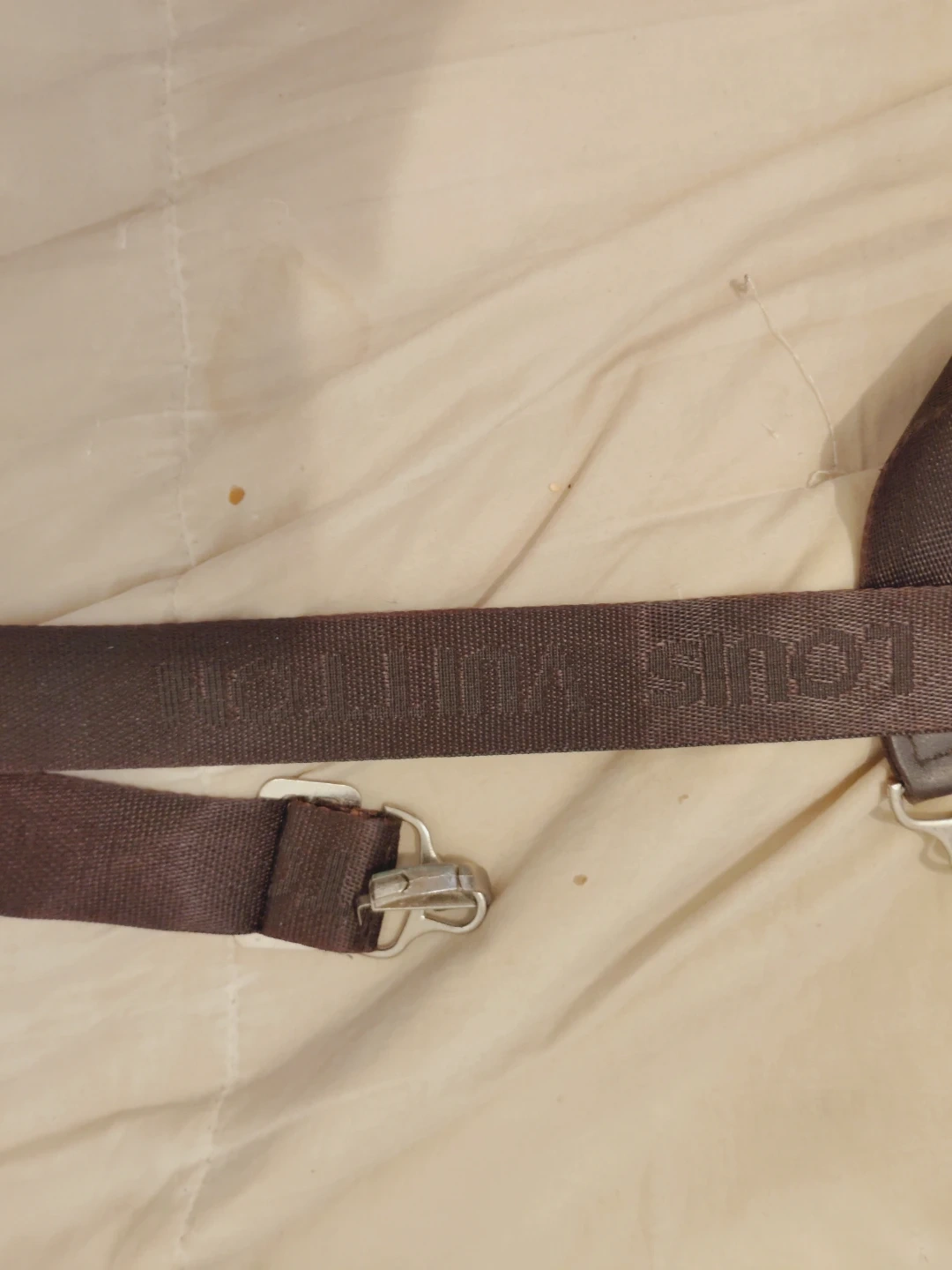 This is an authentic Louis Vuitton adjustable shoulder strap. It's made from durable brown canvas with the Louis Vuitton logo printed throughout. Features silver-tone hardware and a leather accent.