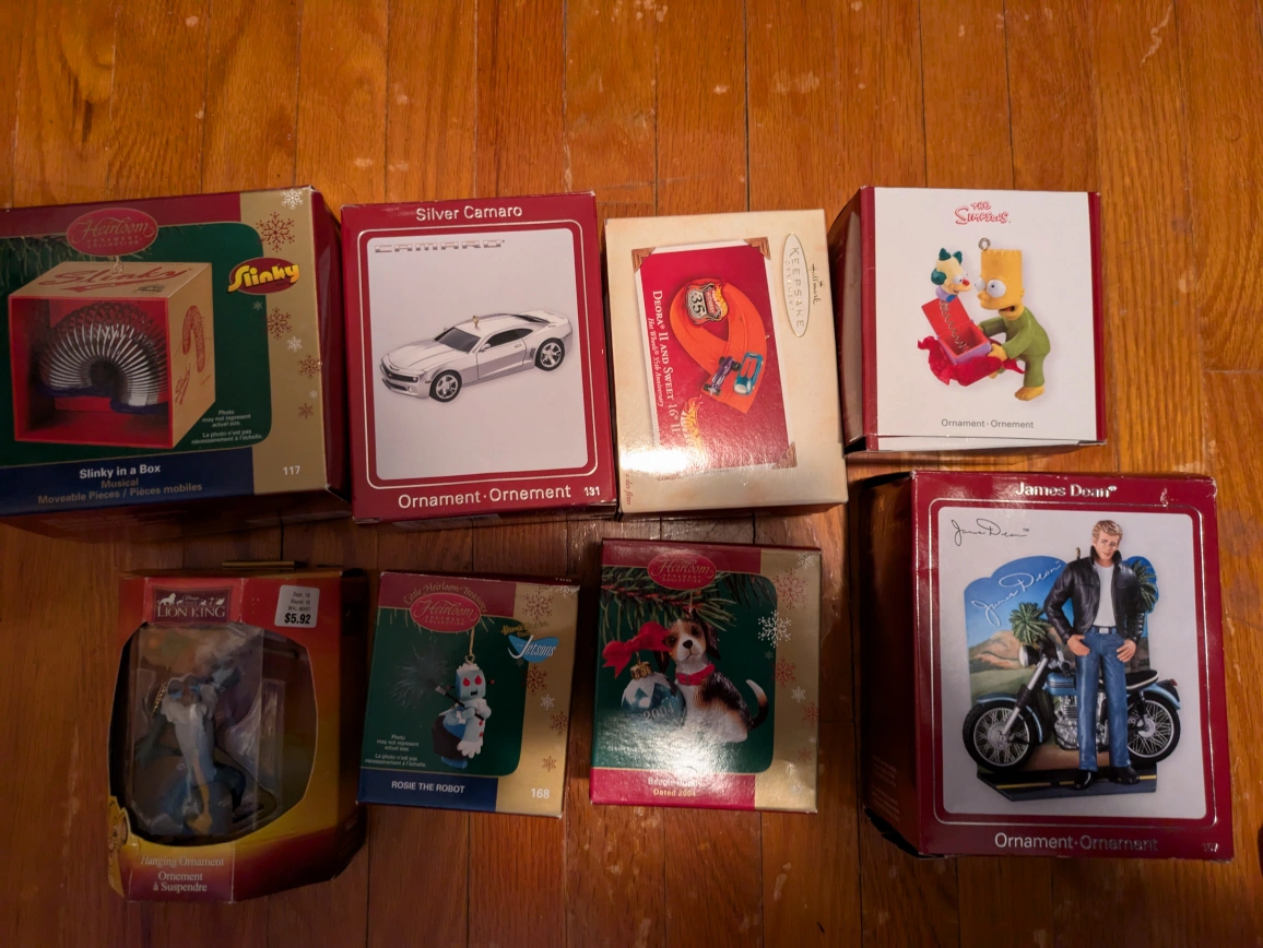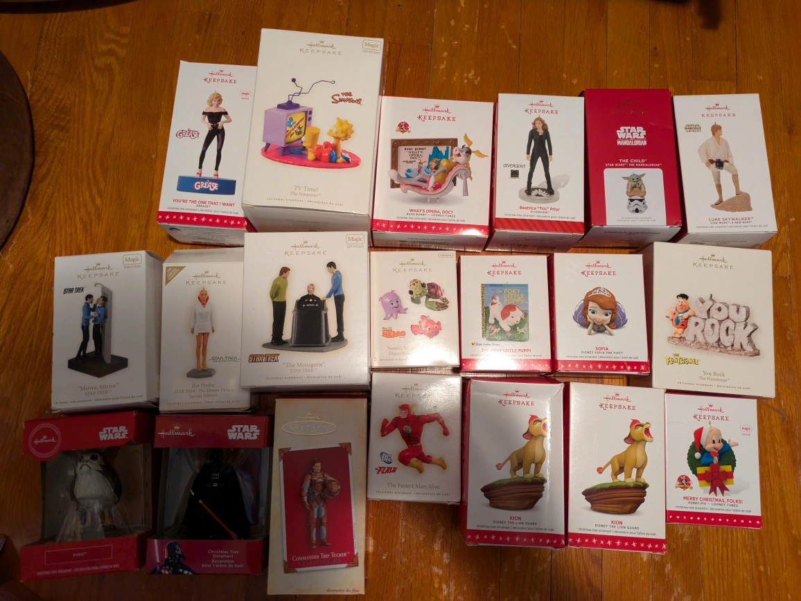 many Carlton cards and Hallmark Christmas ornaments. Includes a variety of characters and themes. Disney store.