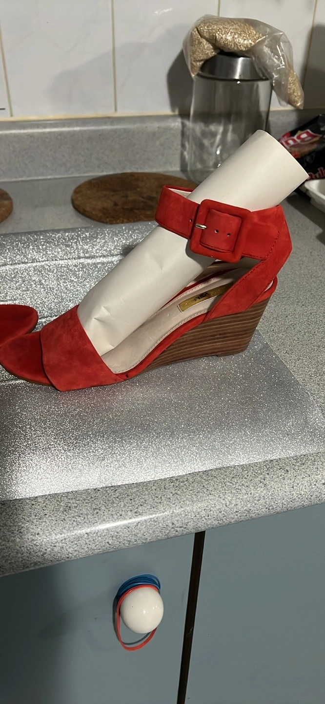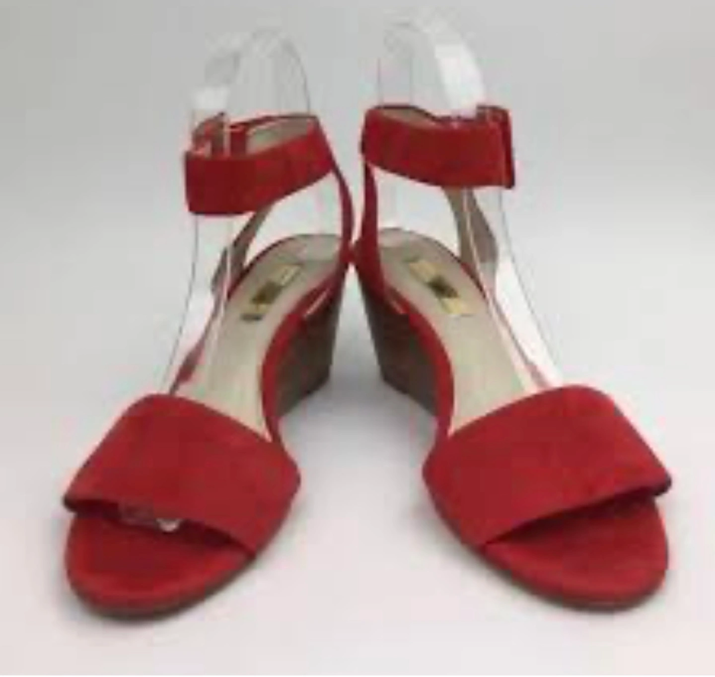 Red suede wedge sandals with ankle strap and buckle. Wedge heel. Open toe. Louise et Cie