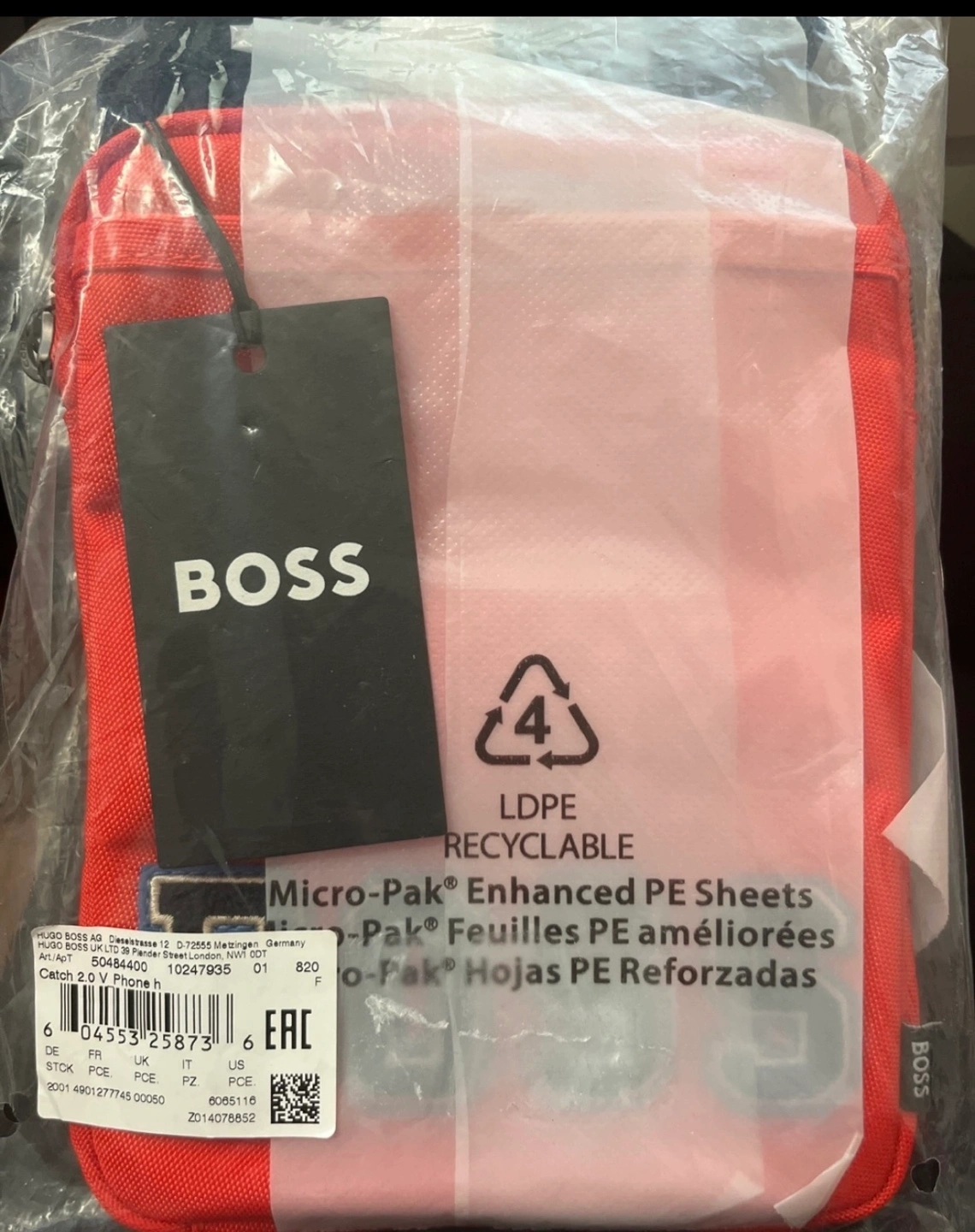 Red crossbody bag with black adjustable strap and a large BOSS logo on the front.