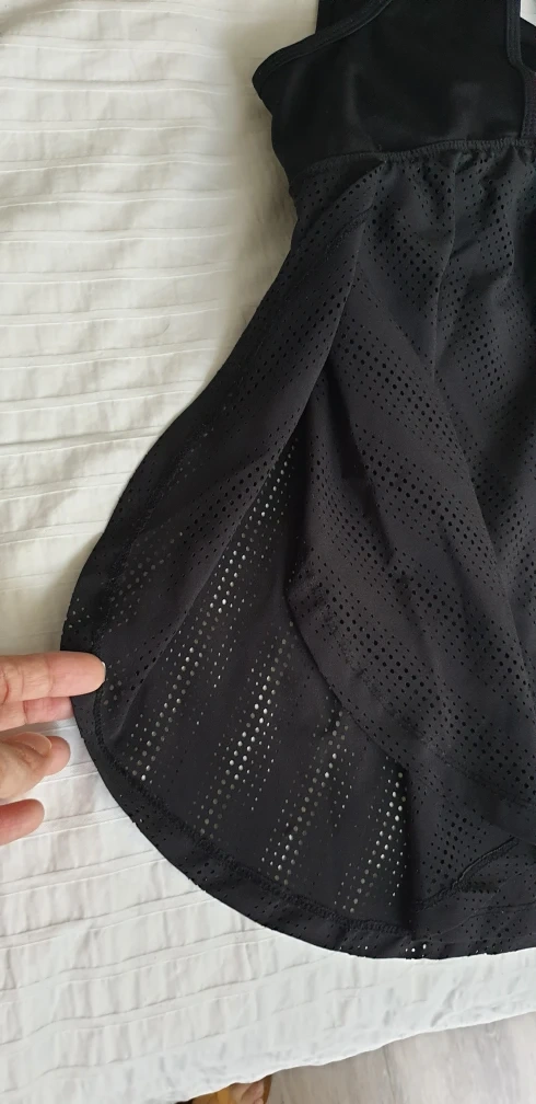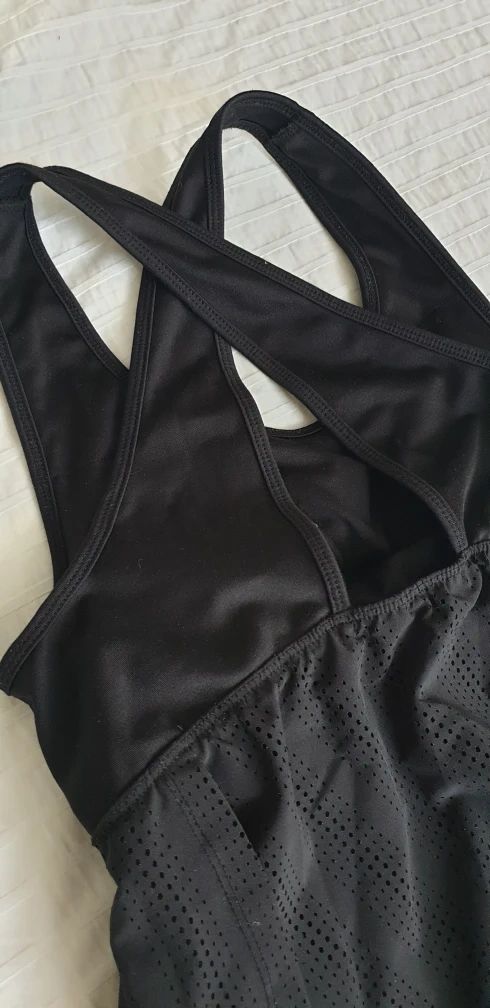 Black tank top with criss-cross back detail. Mesh panel on the bottom. Size XS.
