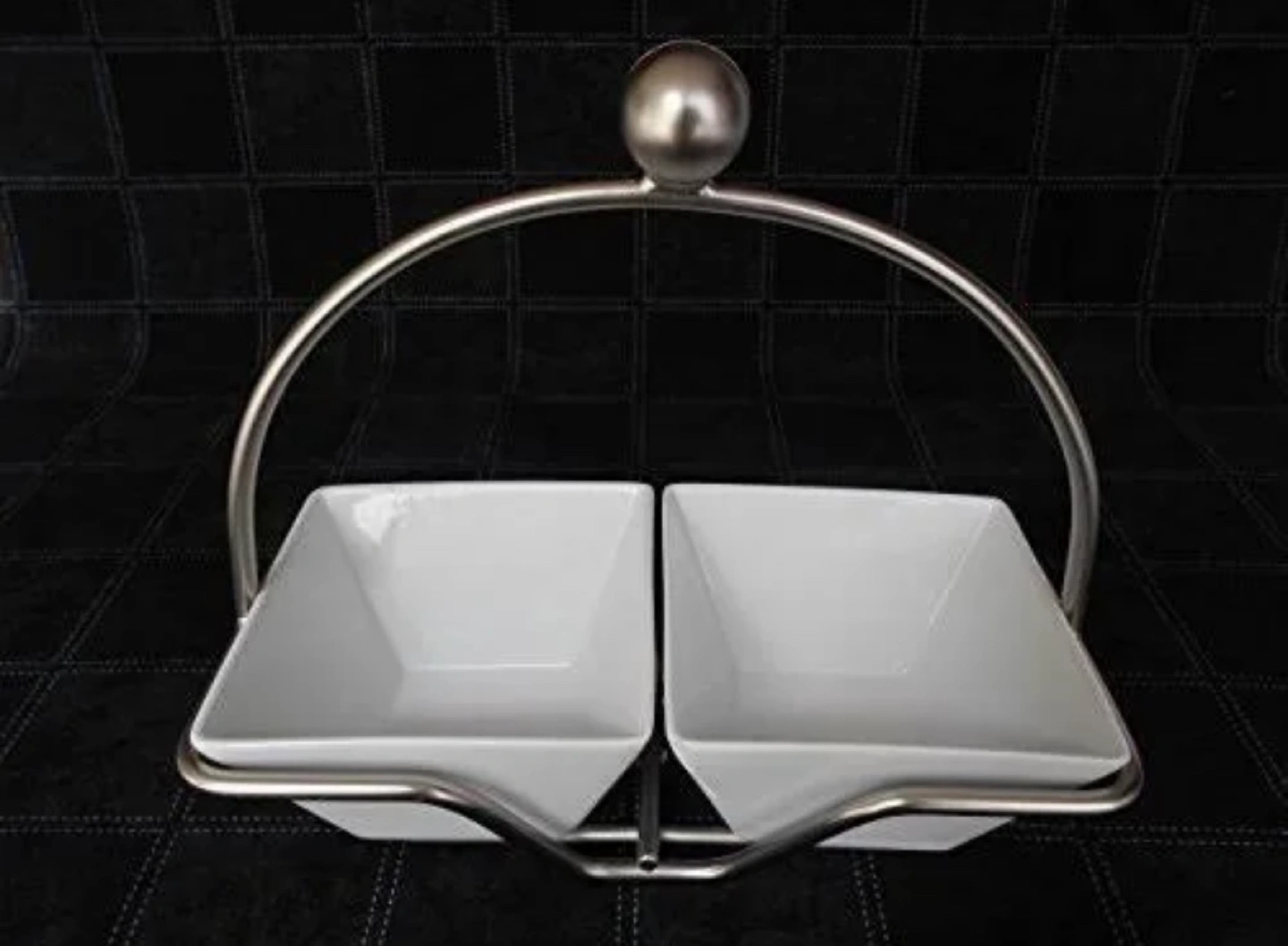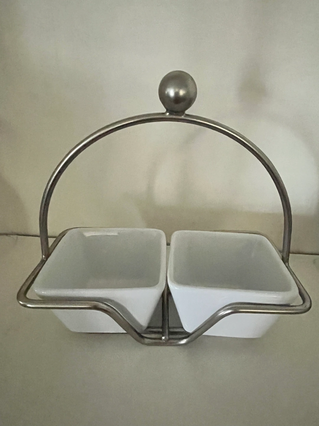 Two white porcelain bowls in a metal caddy. Includes a handle for easy carrying. Suitable for serving sauces, dips, or condiments.