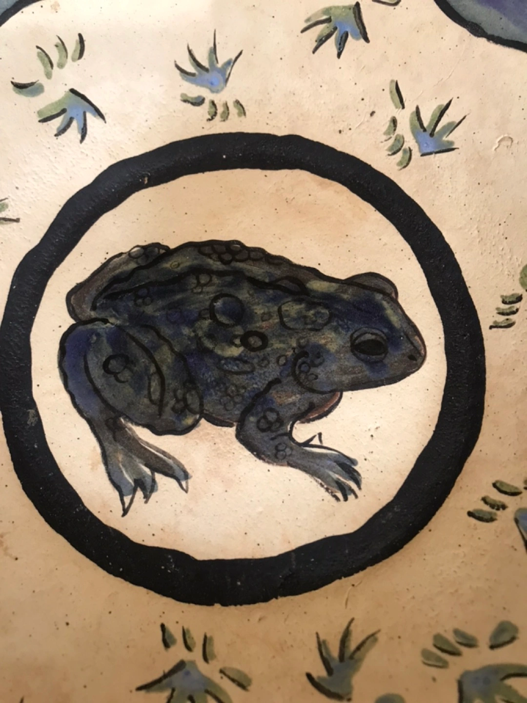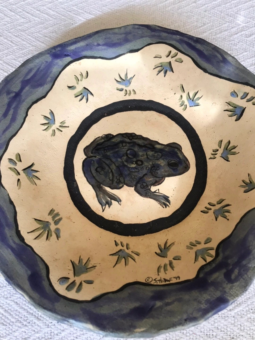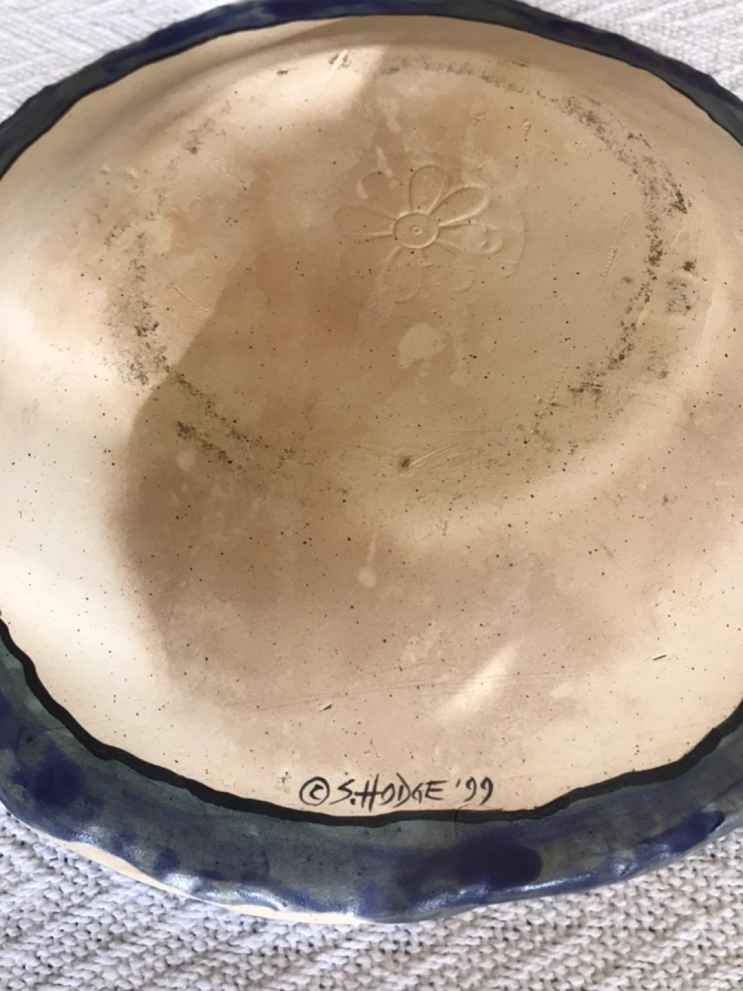 Made 1999 by S. Hodge. Frog dish. 10” circumference. Signed by the artist. Blue and Cream pottery. No chips or cracks.