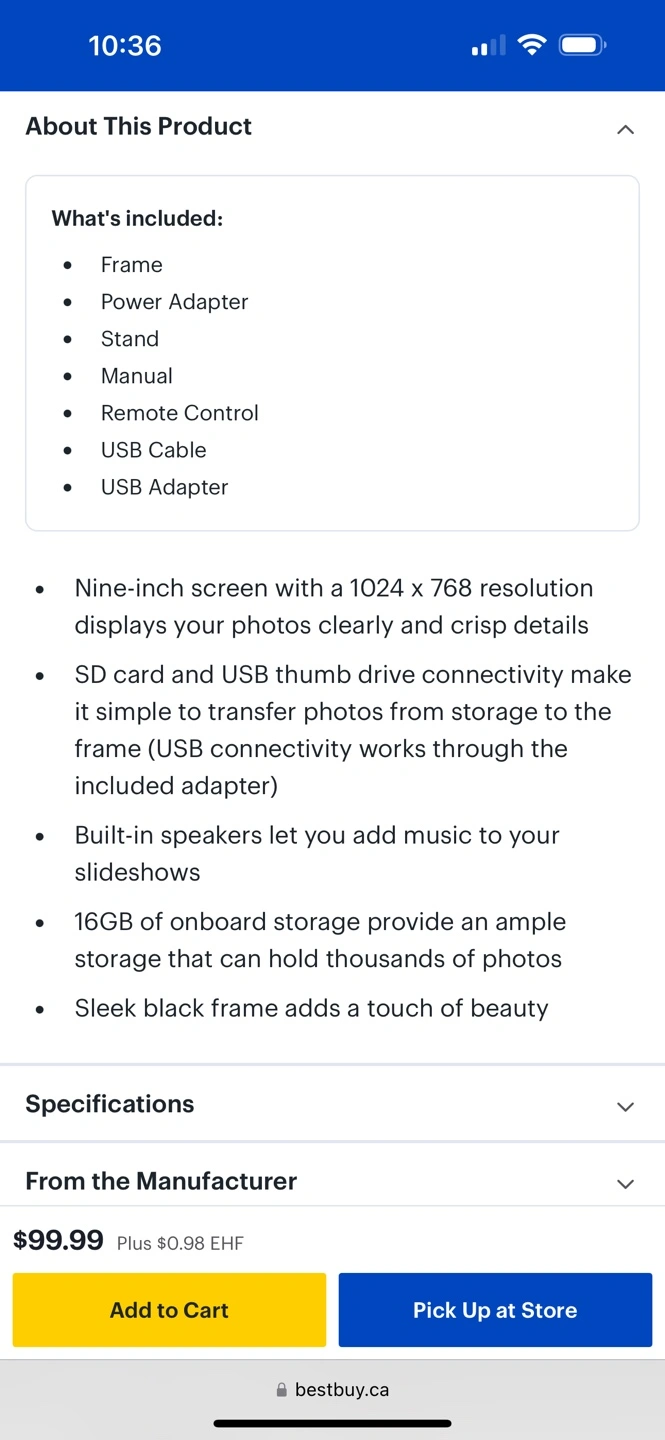 Multimedia digital photo frame with 16GB of memory. Includes remote control and power adapter. Auto rotation.