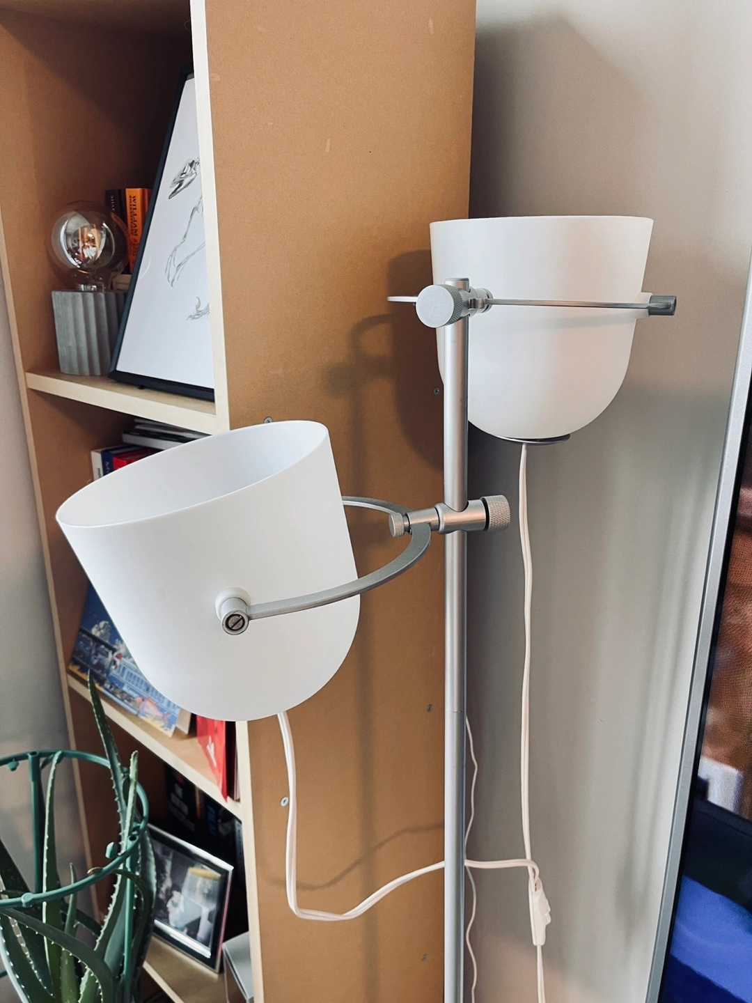 - Silver floor lamp with two white shades. - Both shades can be adjusted and moved independently.