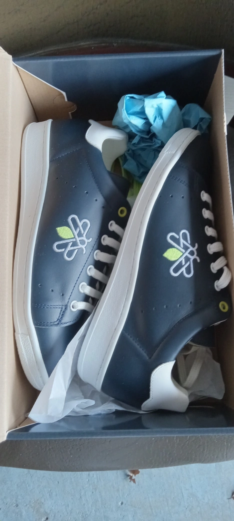 New, never worn vegan leather sneakers with a white sole, white laces and green accents. Comes with extra green laces and a card showing different ways to tie the laces.price is firm