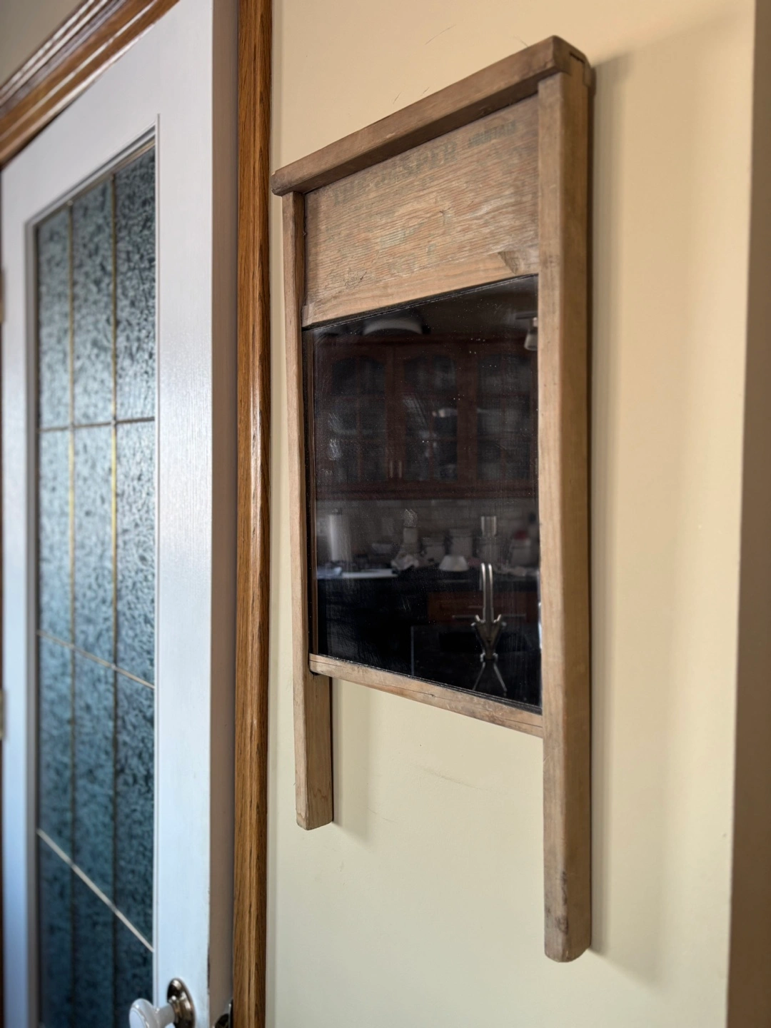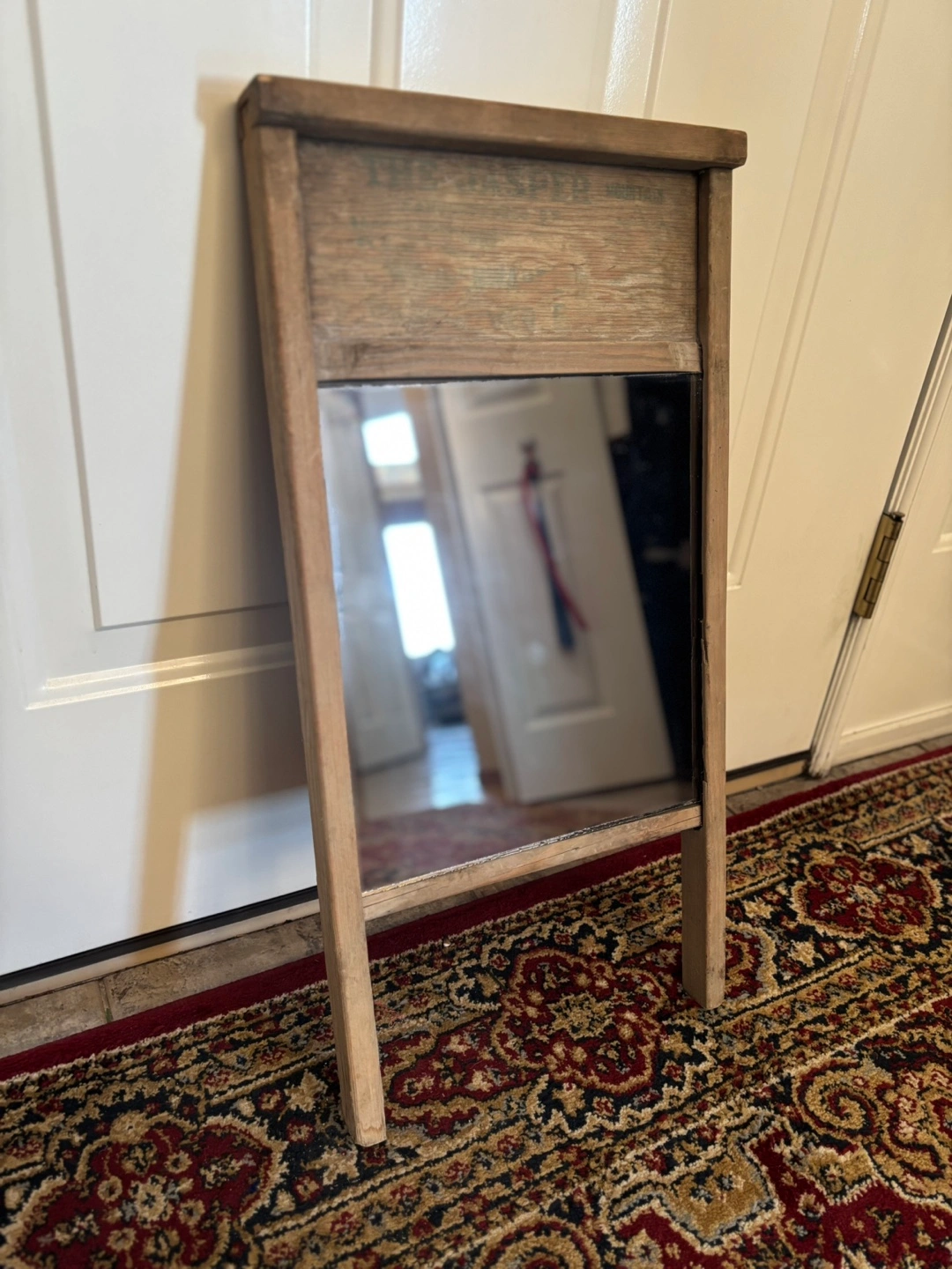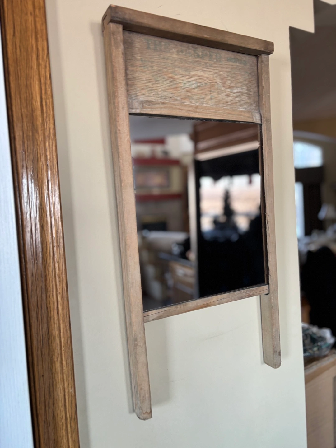 Vintage wooden washboard framed mirror. Good condition. Farmhouse decor . My late father enjoyed collecting antique and vintage items. The washboard glass was broken so he replaced it with a mirror insert. He was an upcycler before his time !!!!!