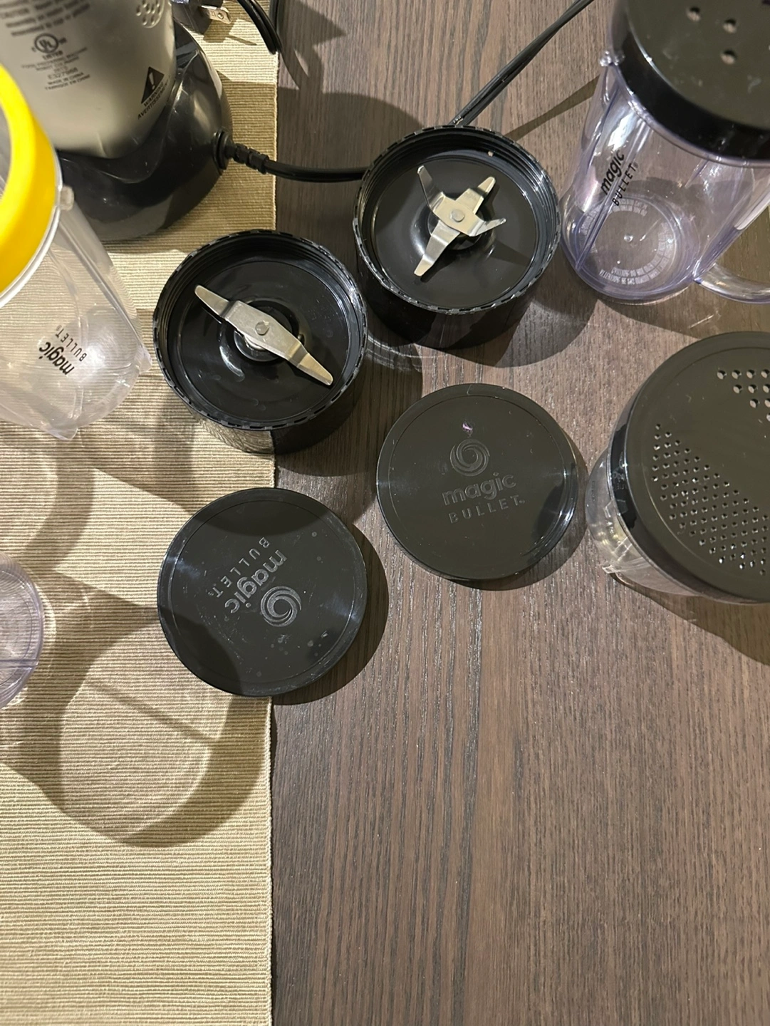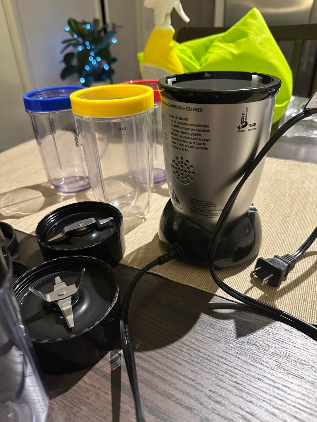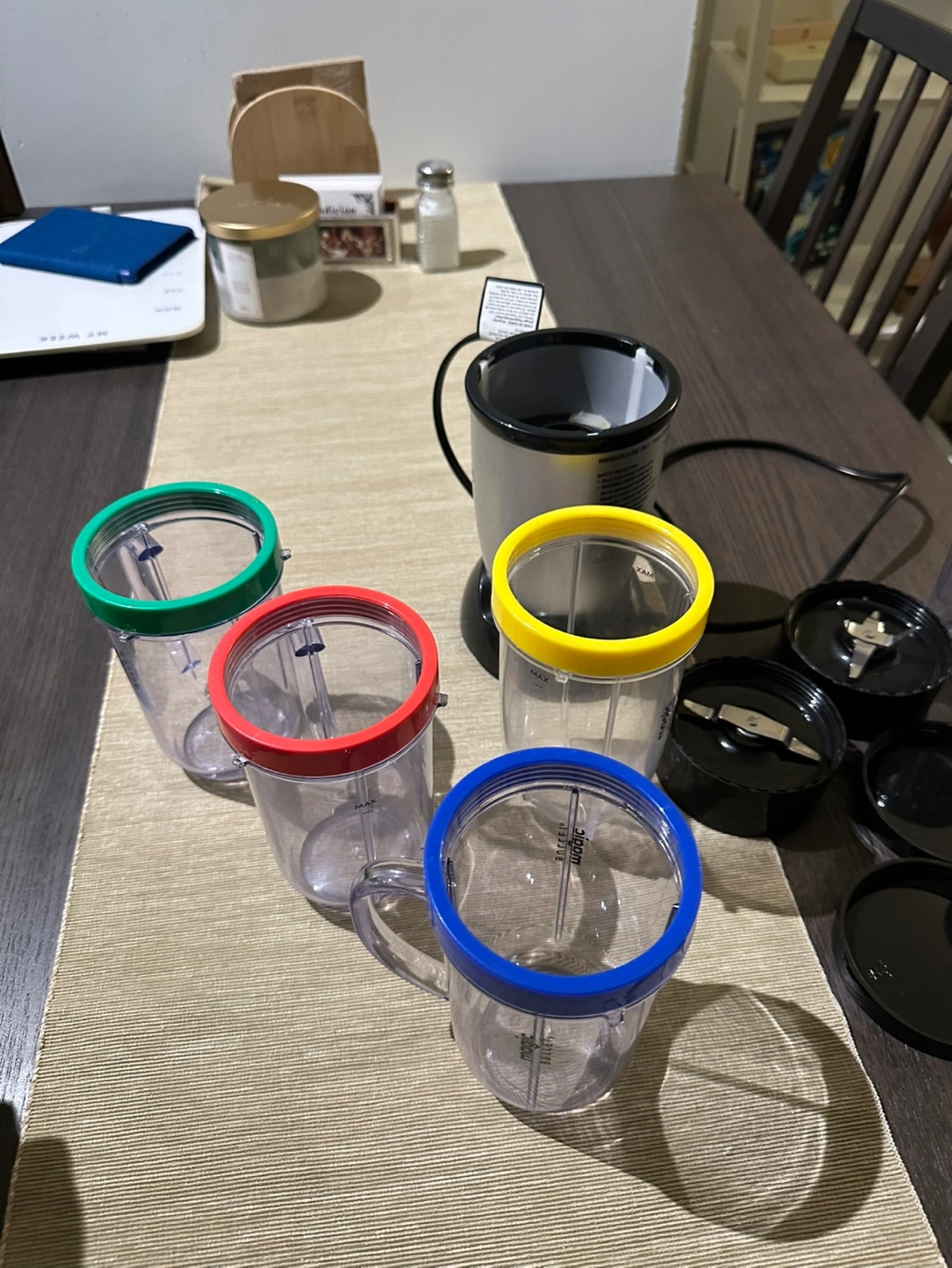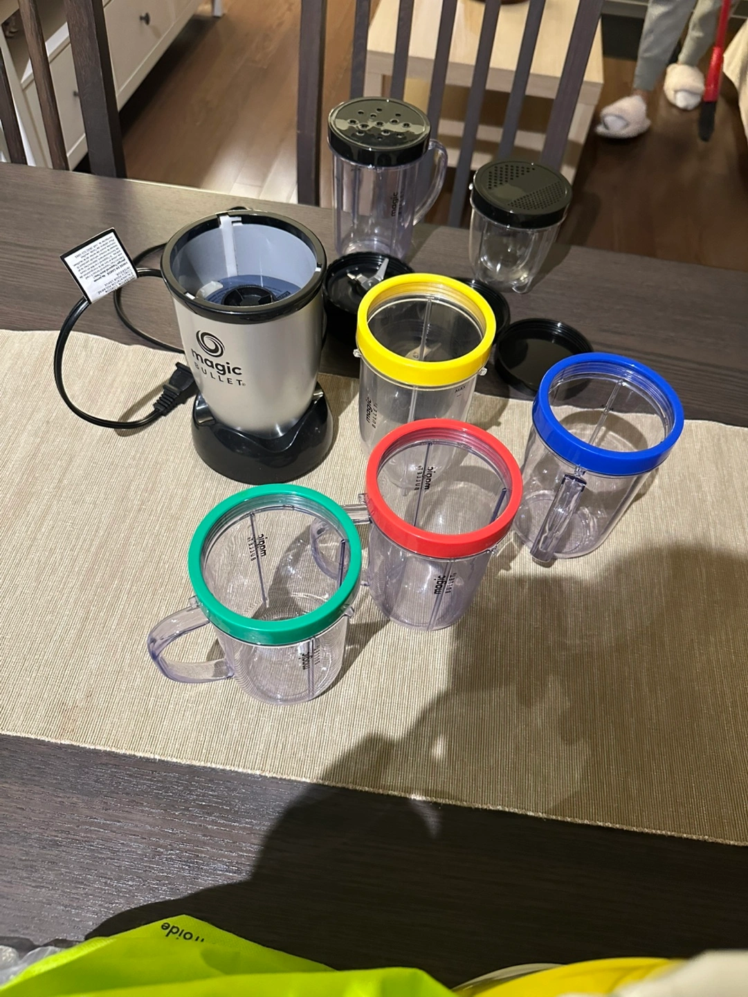 Includes base, 5 large cups $ 1 small cup with lids, two blades, and a lid with a built-in strainer.