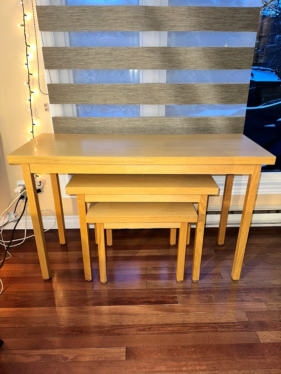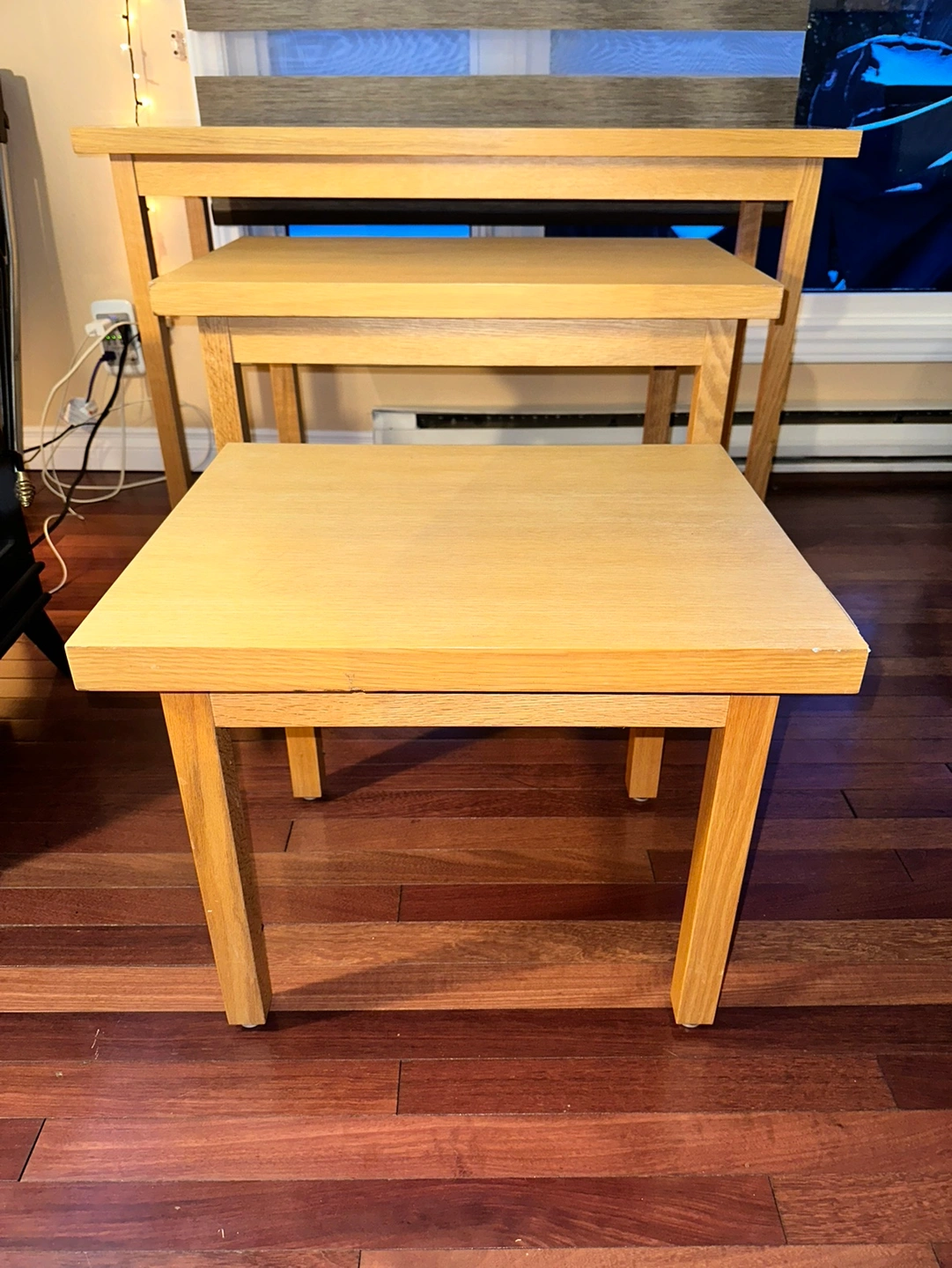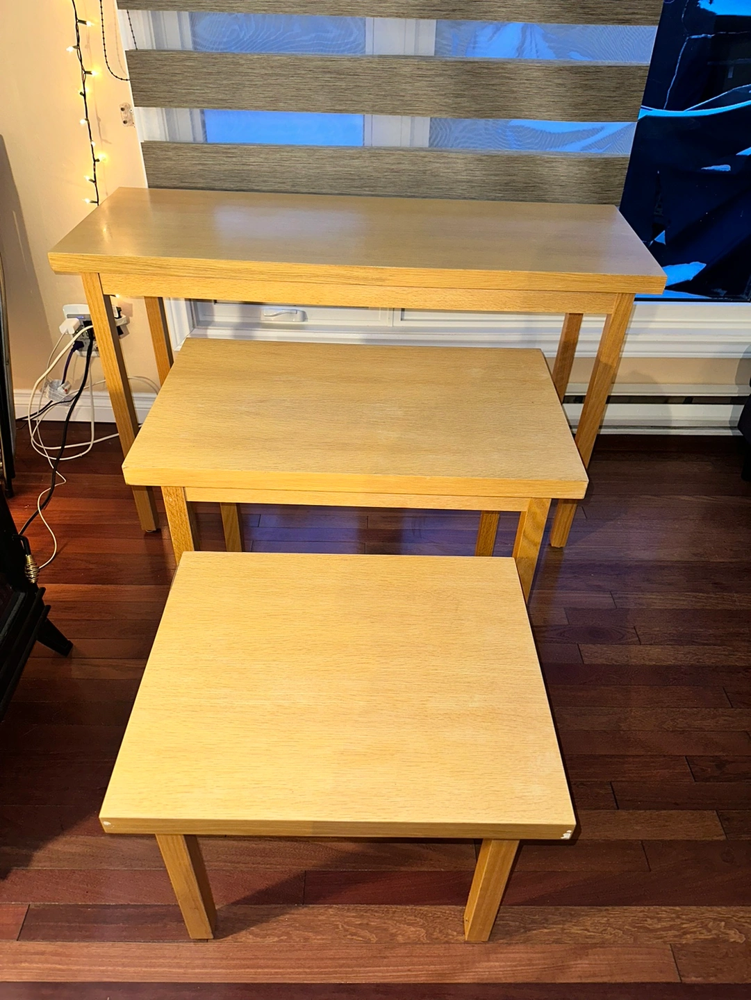 Smallest table has a slight imperfection as the wood is slightly sticking out on the side (as shown in picture), otherwise the tables are in great condition