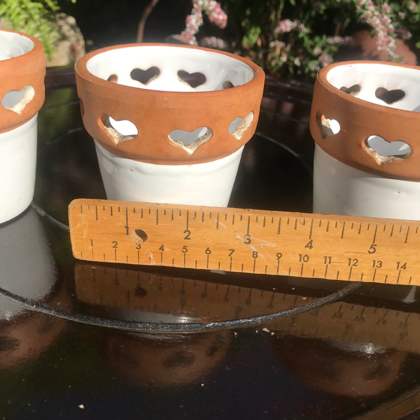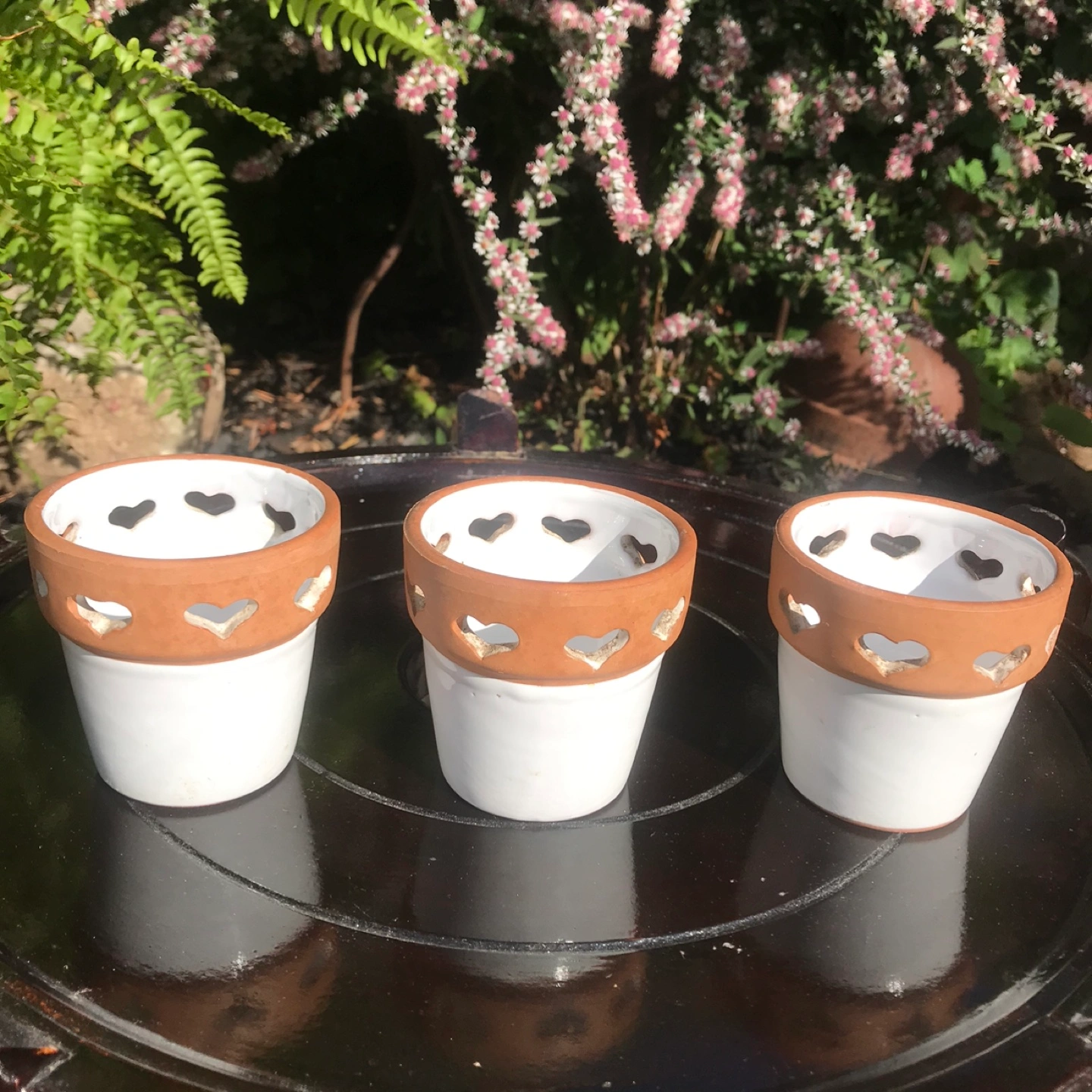 Set of 3 white terracotta pots with heart cutouts. Approximately 3 inches tall. Could be used for plants or as tea-lights. Yonge/Davisville pick up.