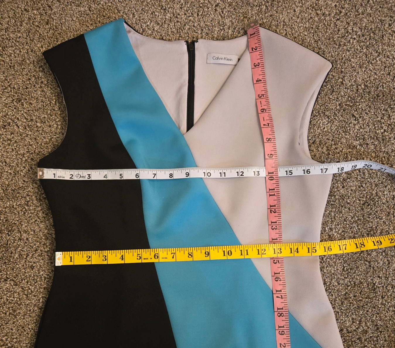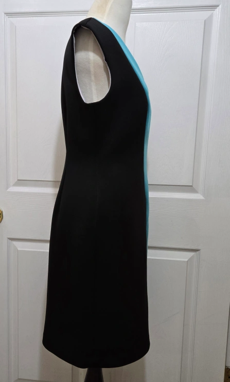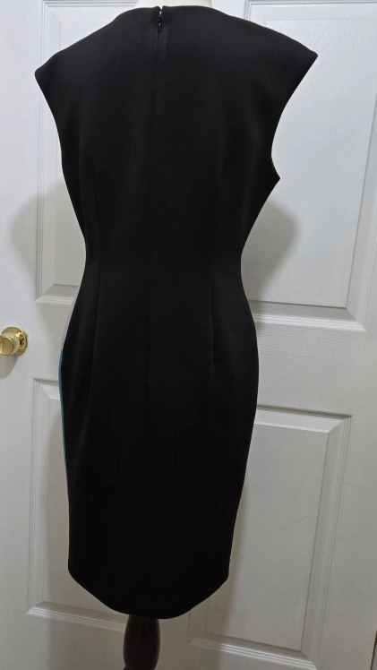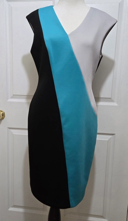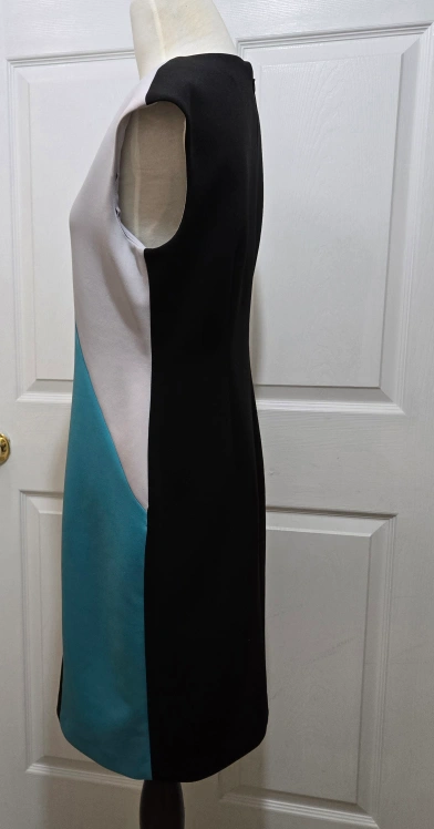 This pre-owned Calvin Klein mid-length sheath dress is perfect for any business occasion. The color block pattern in black, sky blue, and gray with a sleeveless style make it a great choice for summer, fall, or spring. Features a V-neckline and lined ensuring comfort and style. Has a hook & eye and zipper closure. Made with 92% polyester and 8% spandex, this dress is dry clean only and comes in size 8. It is a classic and versatile piece. The dress is a great addition to any wardrobe.