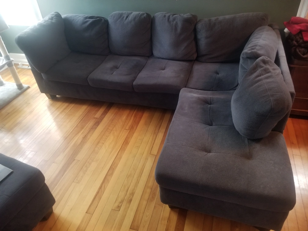 Blue Microfibre Sectional. Lightweight and disassembles easily without tools for moving.