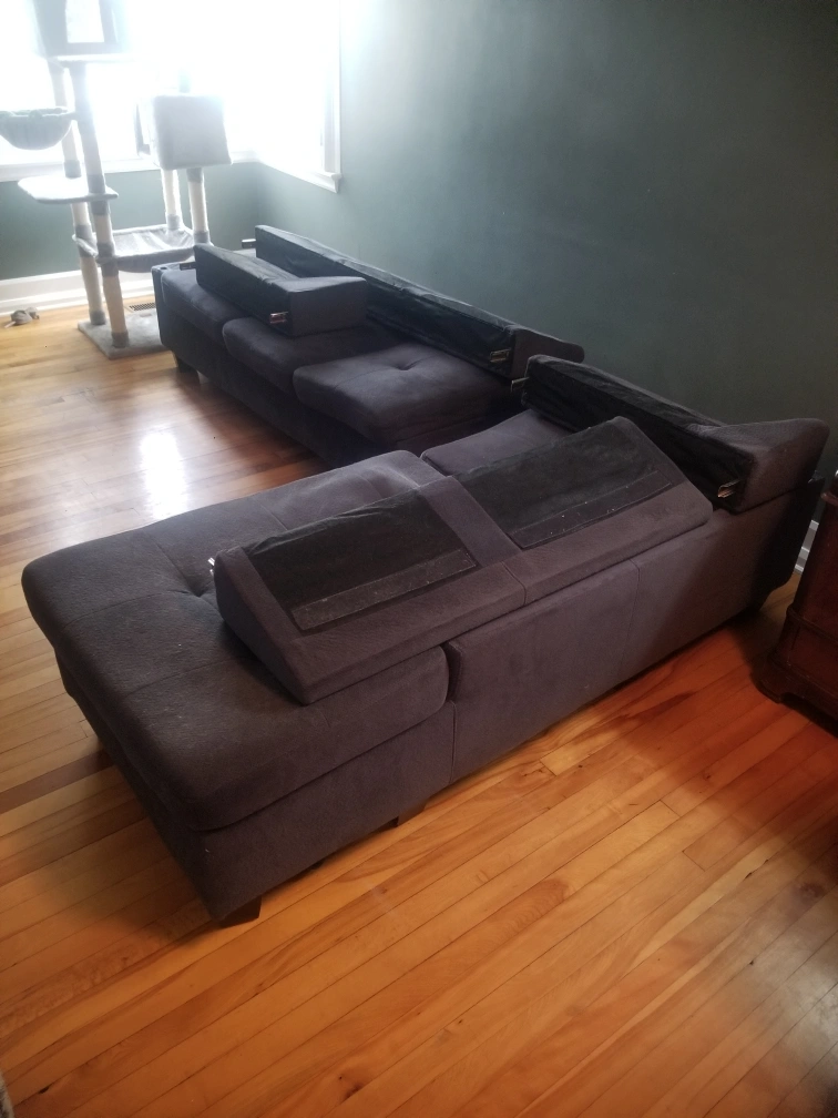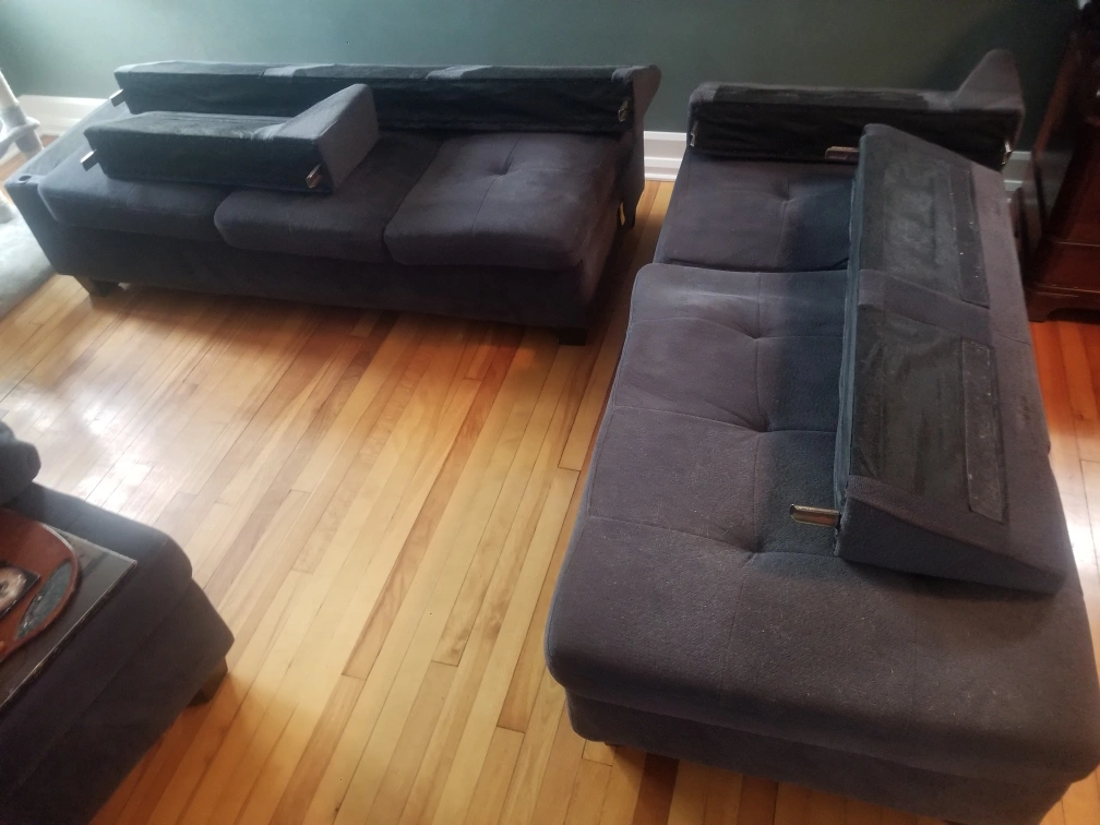 No rips, tears or stains in seat cushions or pillows. Removable pillow cases for washing.