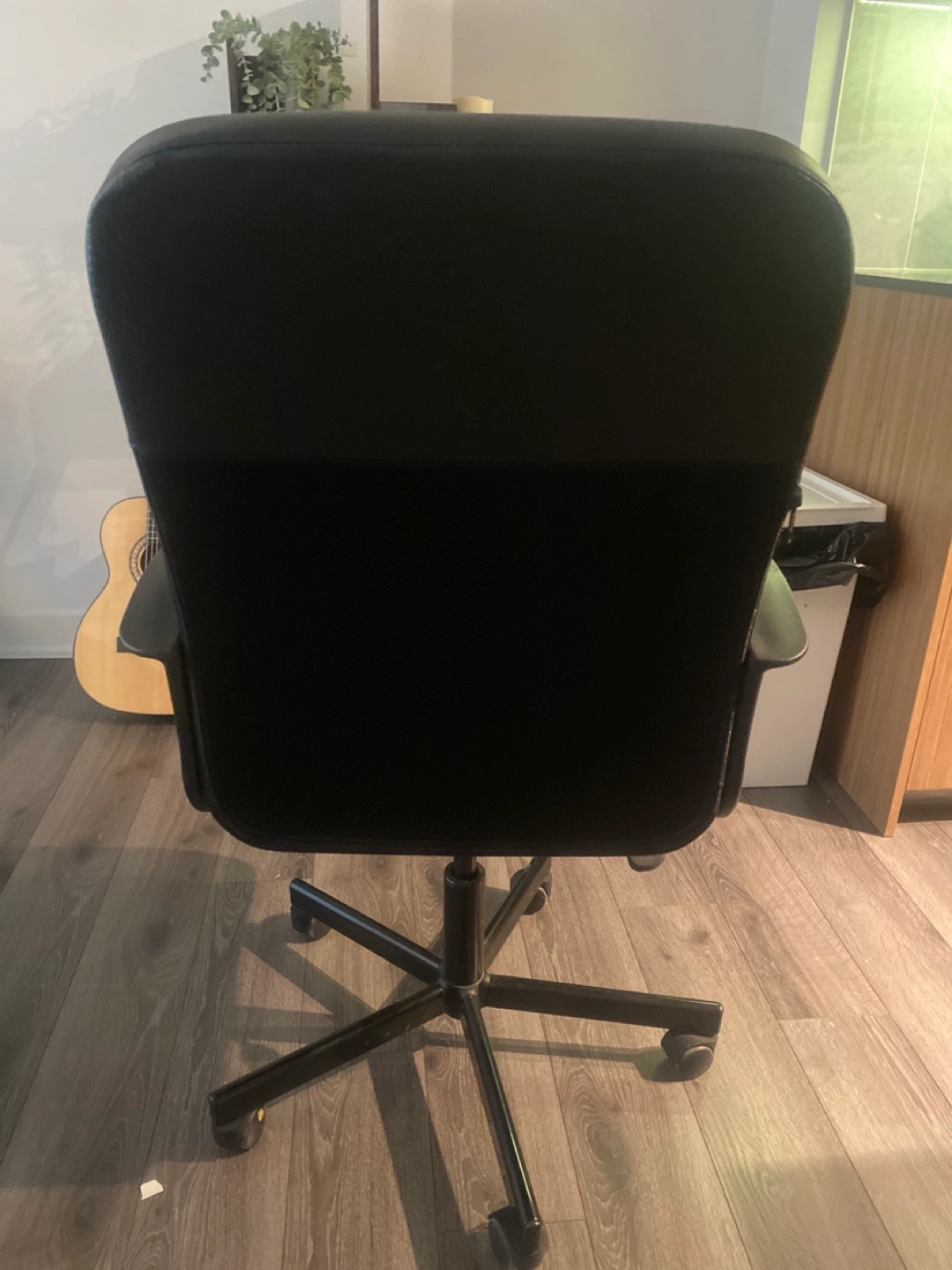 Black office chair with fabric and leather seat and back. It has adjustable height and swivels. The chair is in good condition and has been used for a short period.