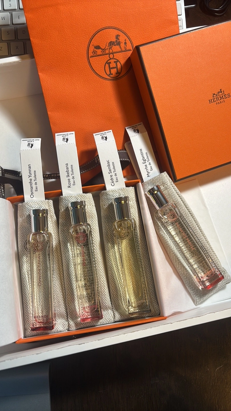 Set of 4 miniature perfumes. Includes: Osmanthe Yunnan, Rose Ikebana, Cèdre Sambac, Myrrhe Églantine. Holiday gift
