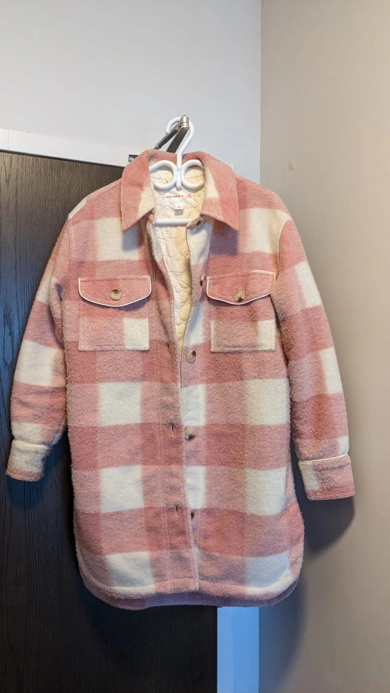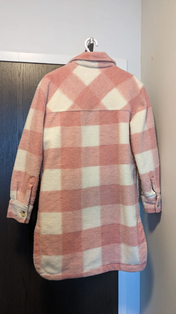 Joe Fresh x Jillian Harris pink and white plaid shacket (shirt jacket). Size M/M. Long sleeves. Button up. Two front buttoned pockets and two size pockets.