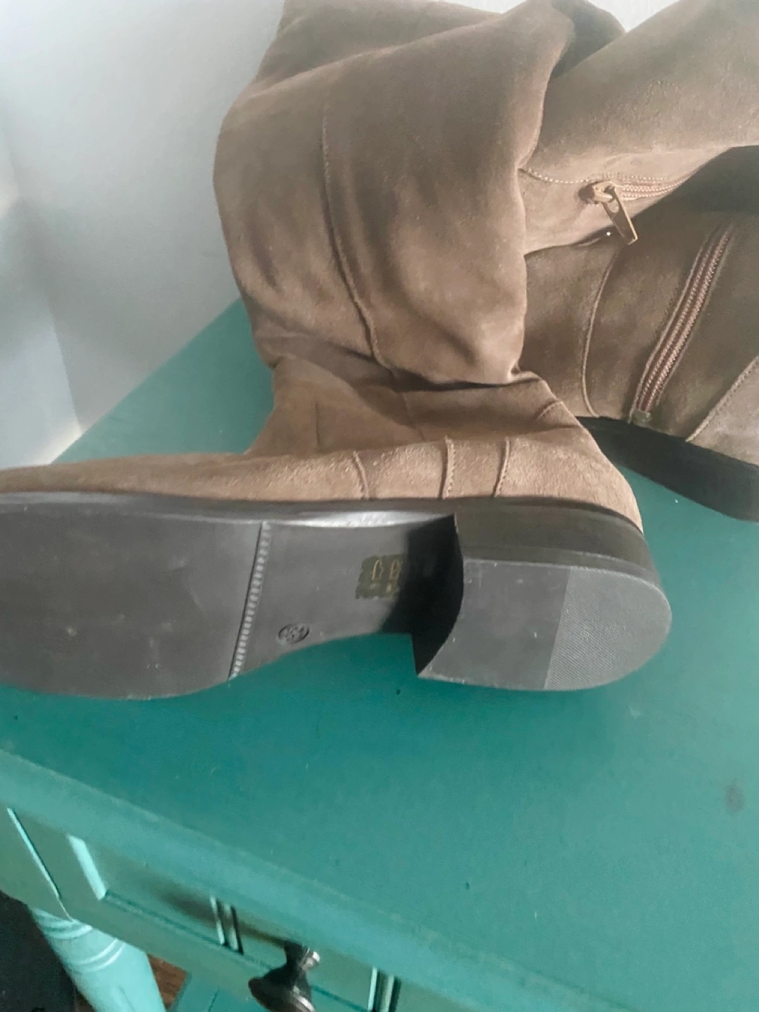 Tan Suede over the knee boots with side zipper and buckle detail. Low heel. Paid 180.00 original, never worn sz 38 (7.5)