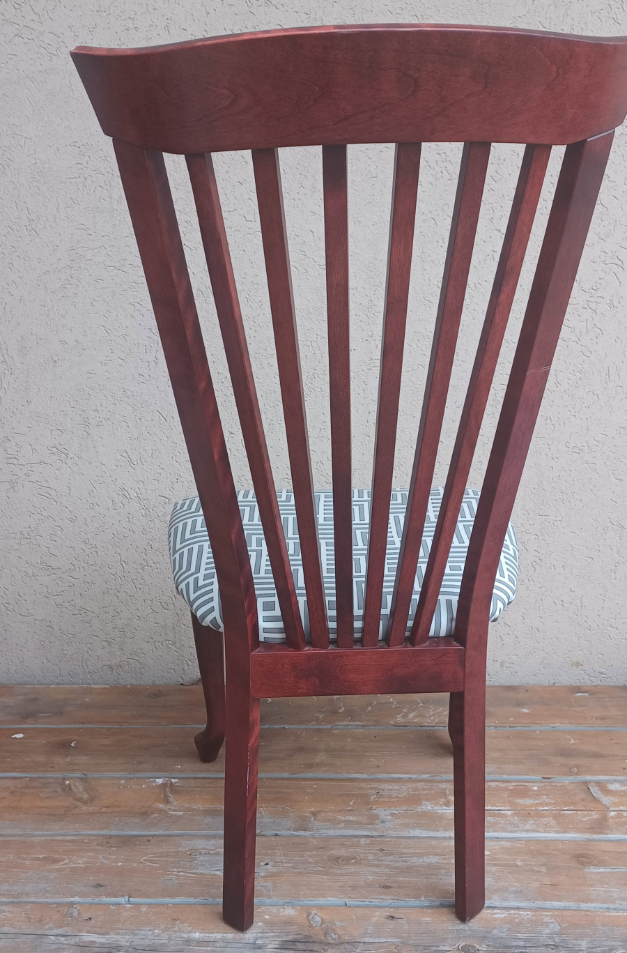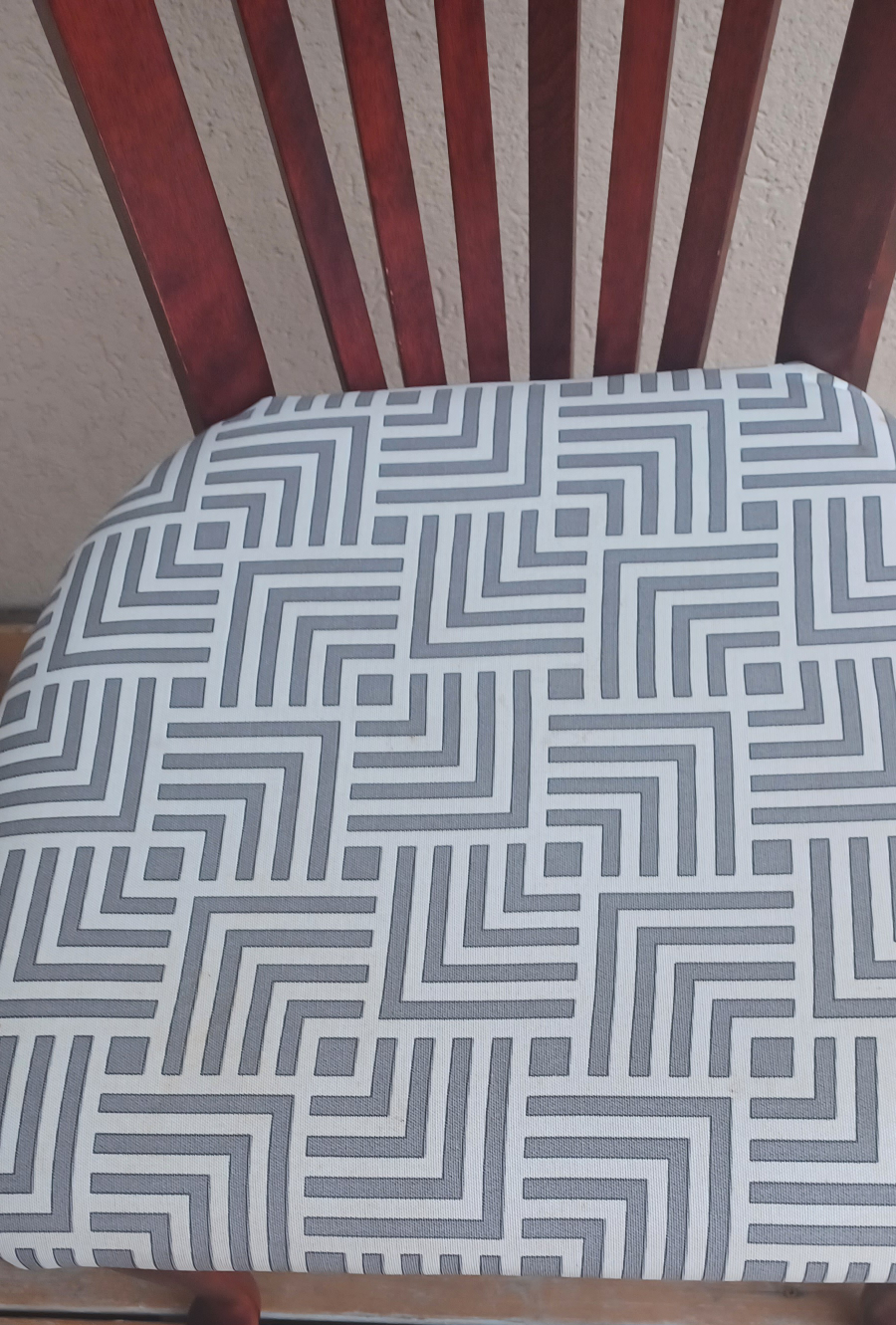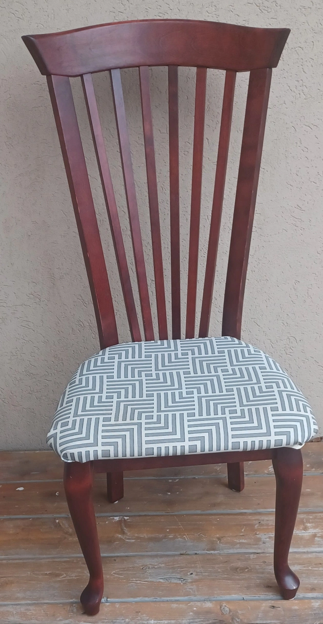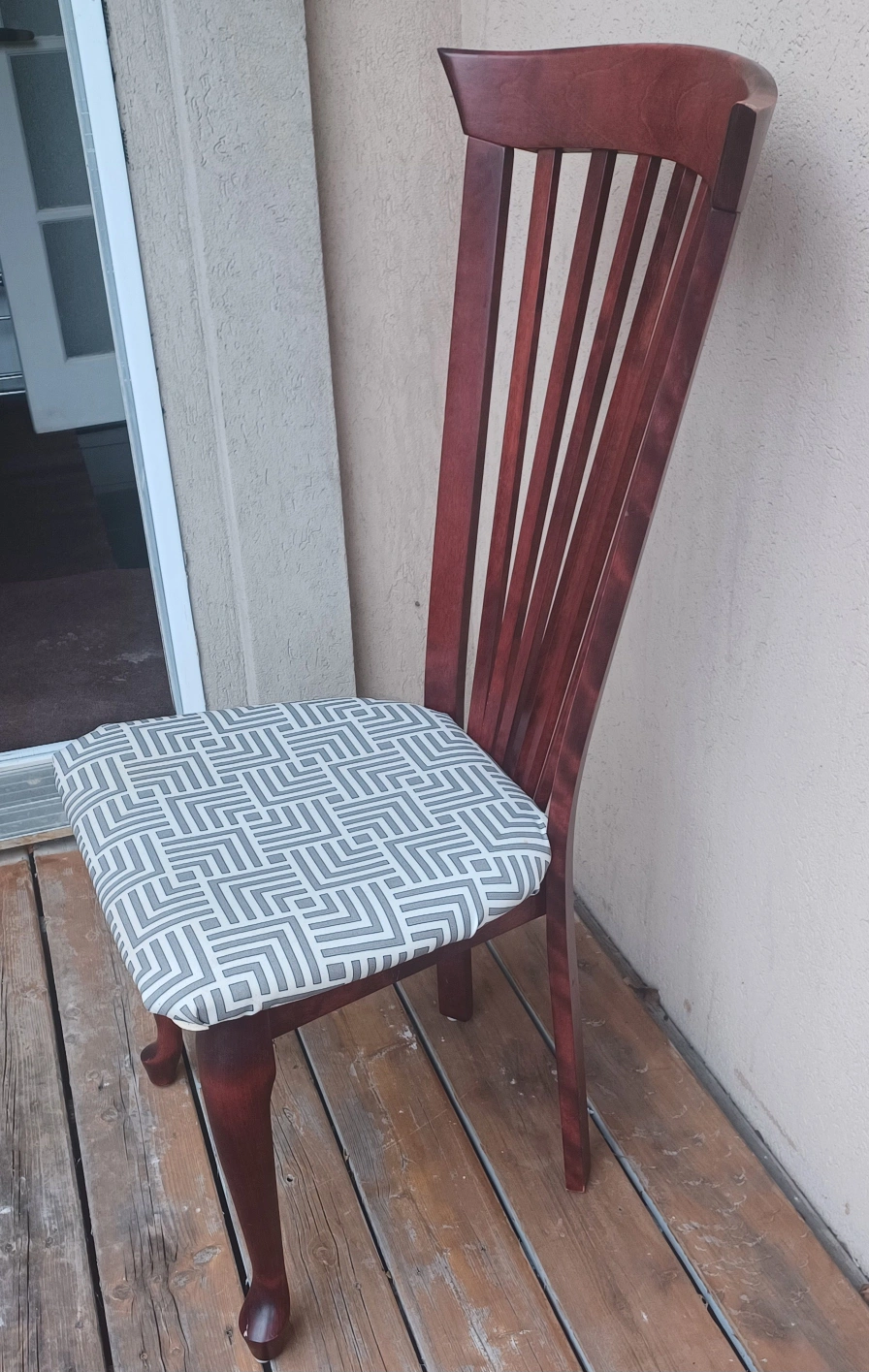 Solid wood dining chair with a geometric patterned cushion. Sturdy and in good conditions Burgundy colour