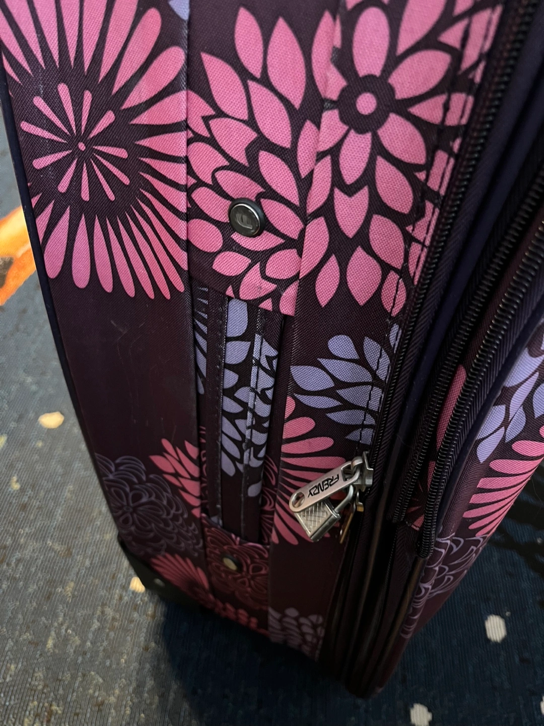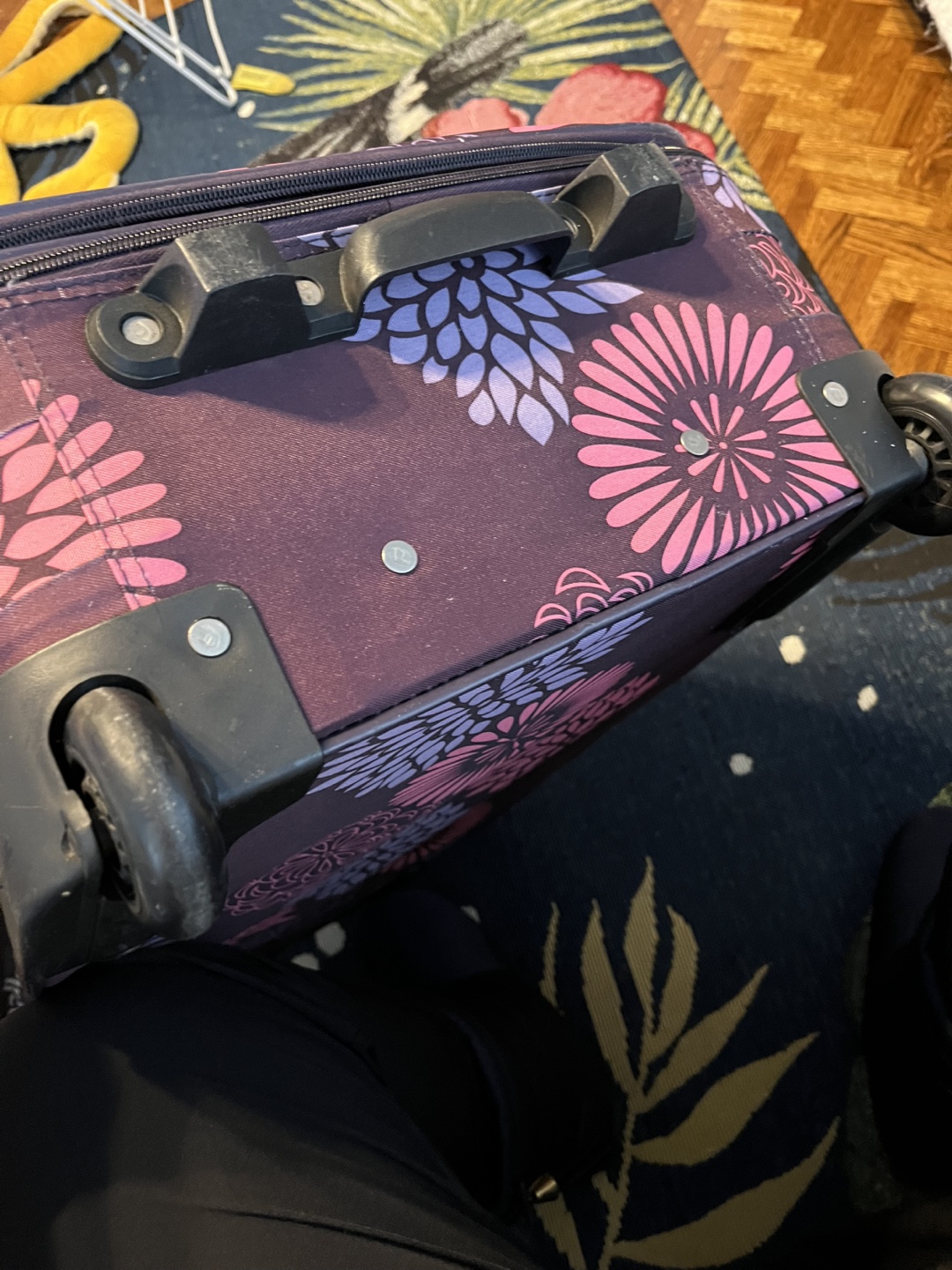 Purple rolling suitcase with pink and purple floral print. Four wheels. Extendable handle.