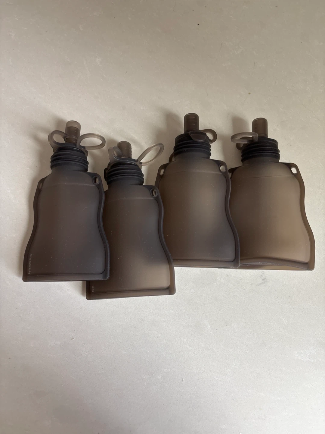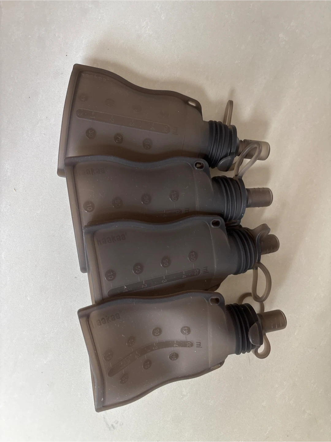 This set includes four reusable silicone food pouches from Haakaa. They're designed for easy feeding and storage of baby food or snacks. Each pouch has measurement markings and a secure cap.