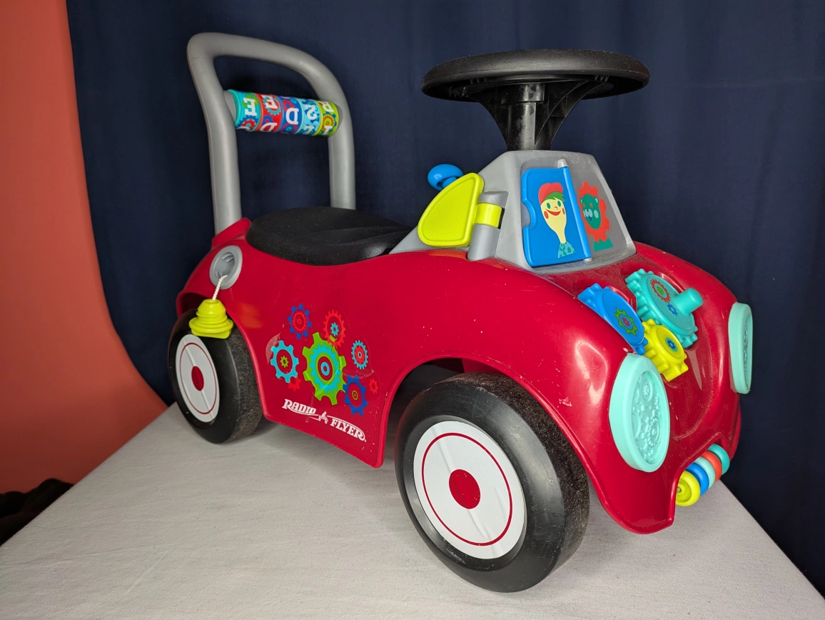 Super fun Radio Flyer Push/Ride-On Toy. Has storage in the seat and lots of bits and bobs to twist and play with. My kid loved this toy. $10