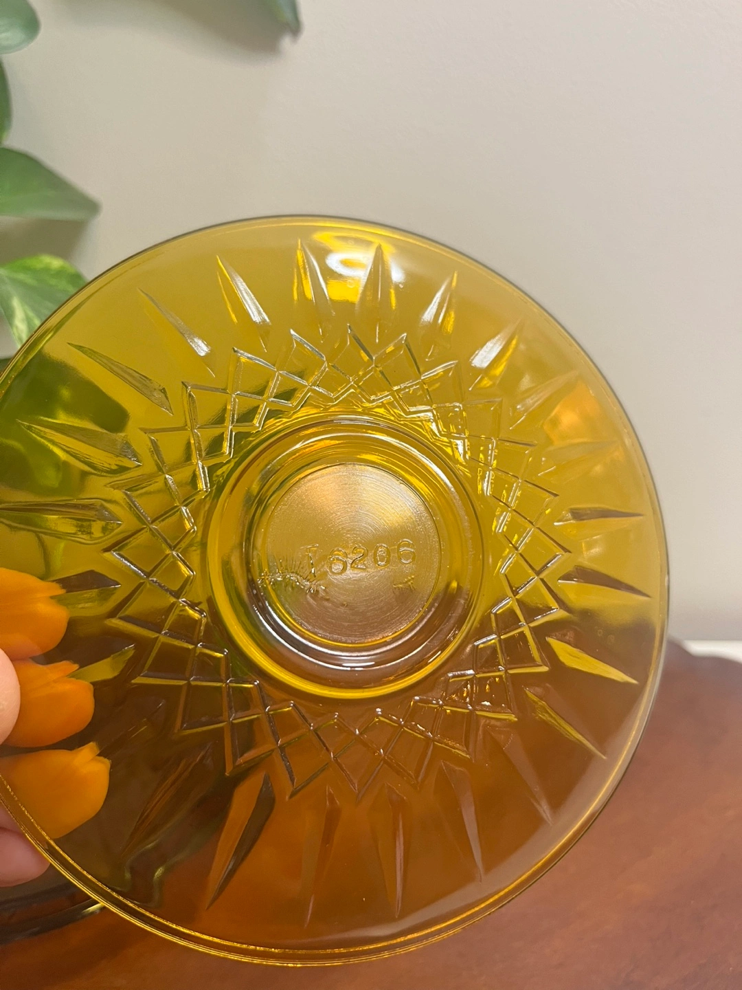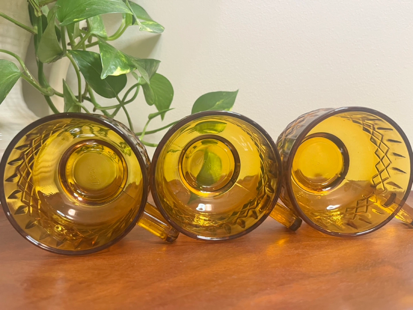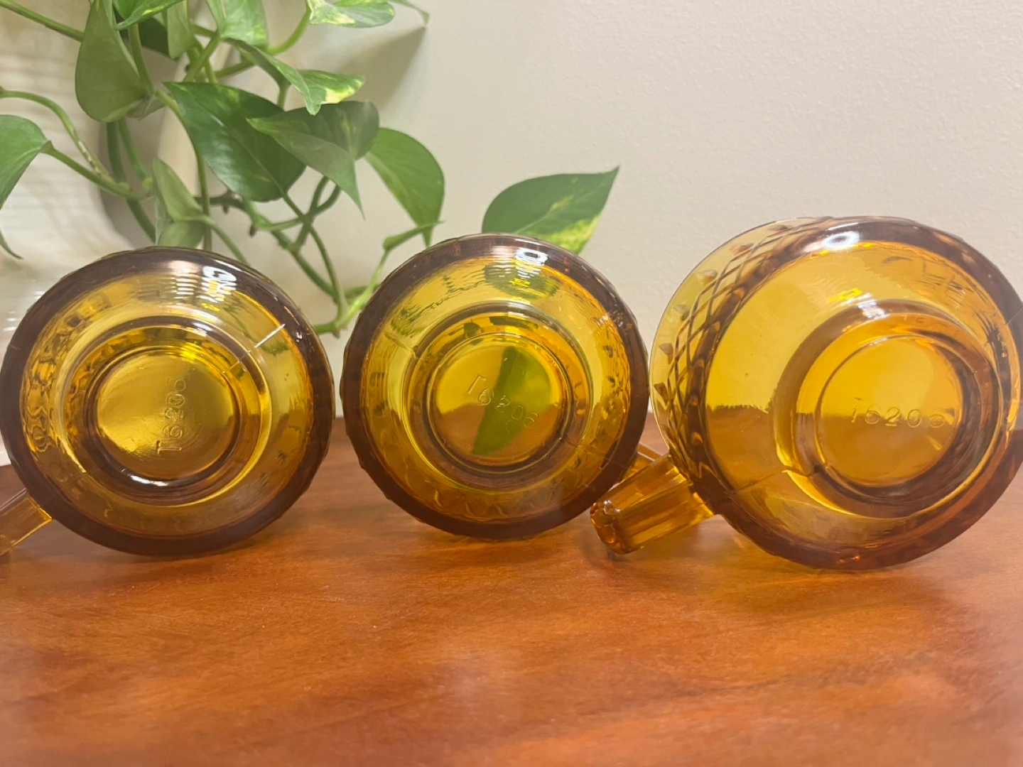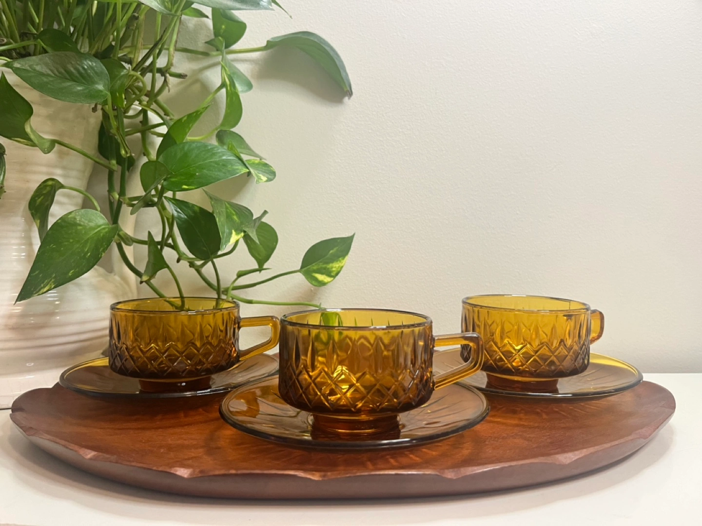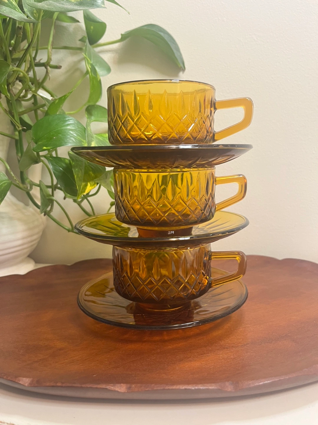 Set of three amber glass teacups and saucers. The cups and saucers have a diamond pattern. Set of 3