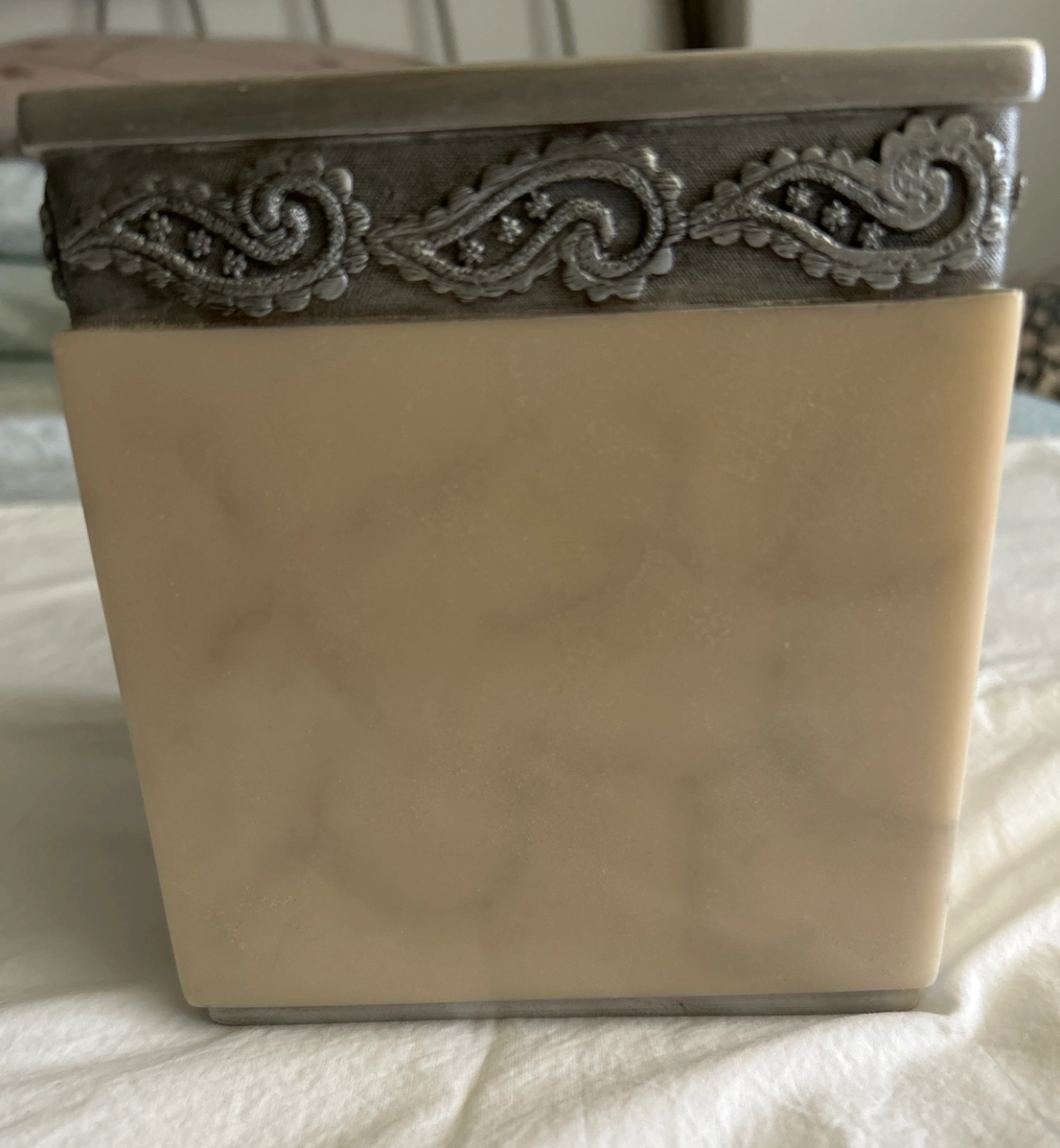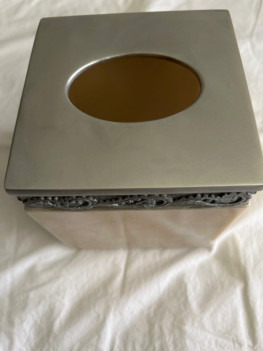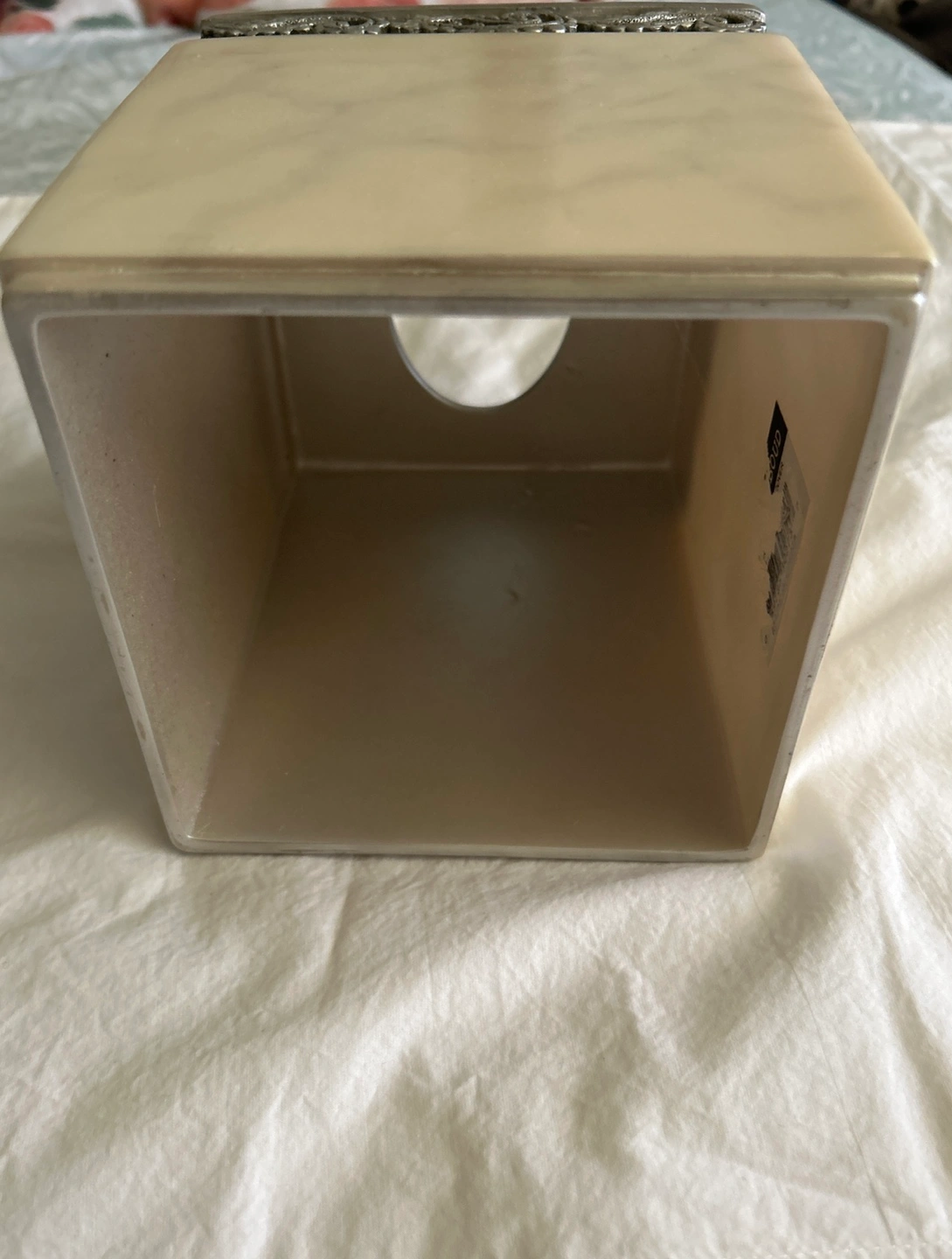 1000+Tissue box cover with silver trim. Marble design. No chips and in very good shape. Porcelain - faux marble look.