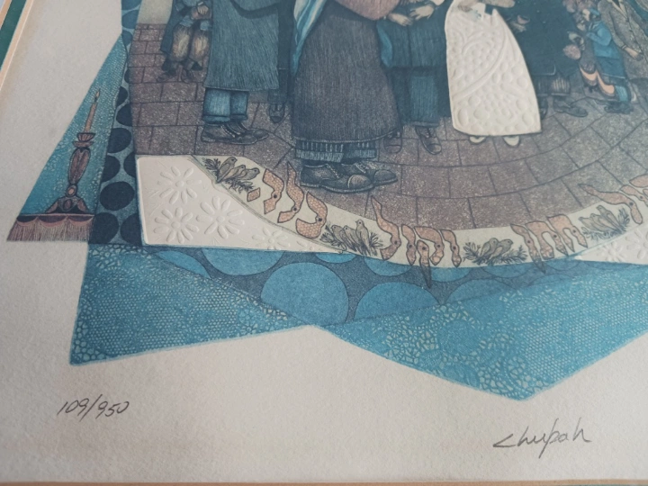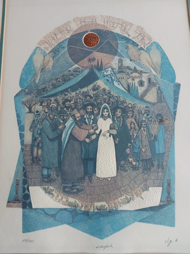 Genuine Framed "Chupah" print with golden seal by Ebgi, signed 109/150. The print is in mint condition (minor wear on matte,)