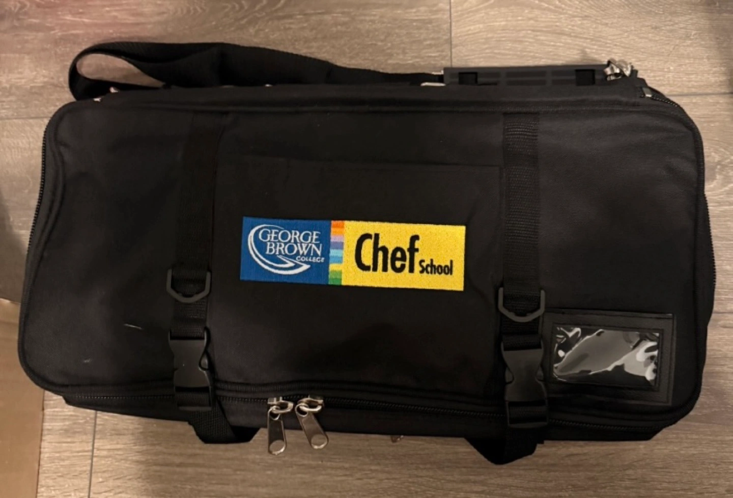 Black bag with a zipper closure and a clear plastic pocket. Has a George Brown College and Chef School logo.