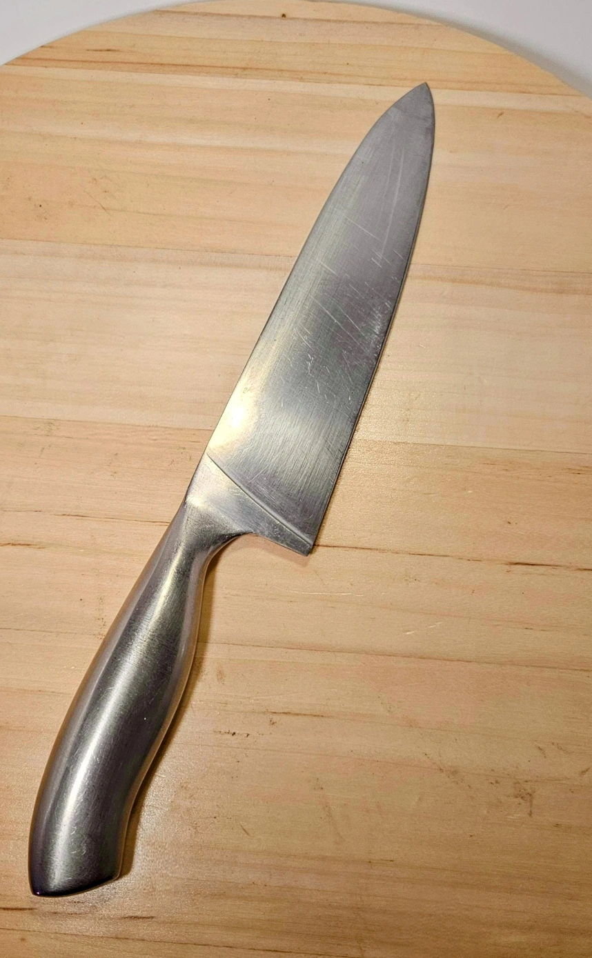 Stainless steel kitchen knife with a silver finish. Good for beginners. 7" blade.