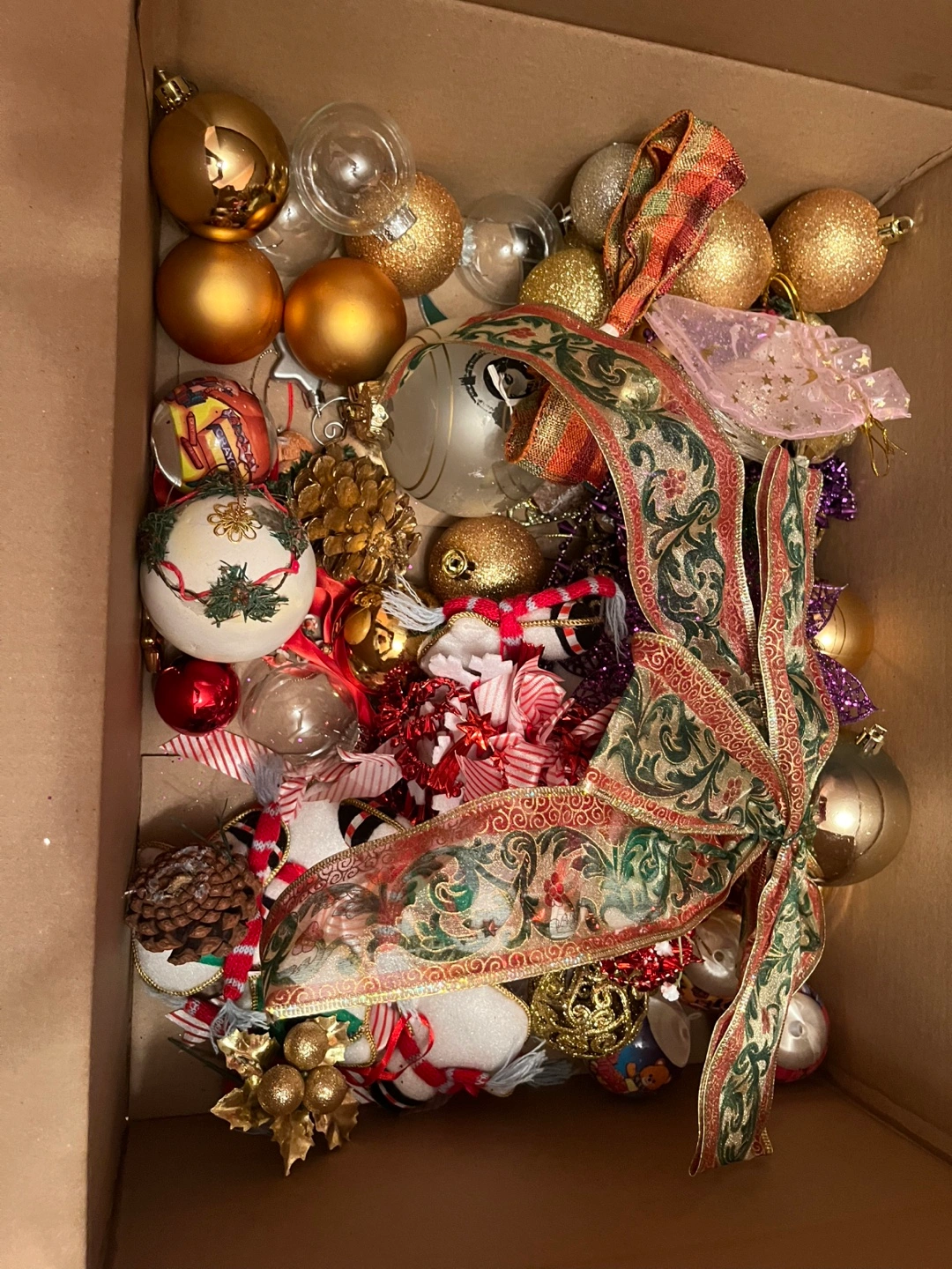 A box full of ornaments and decorations. Some ornaments are clear glass. Some ornaments are gold, silver, and red. A few ornaments are in unique shapes. There is also a ribbon, tinsel, and other decorations in the box.