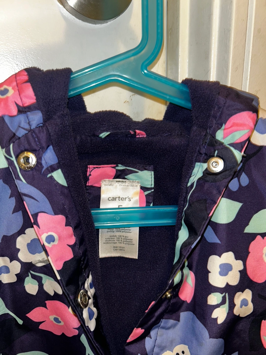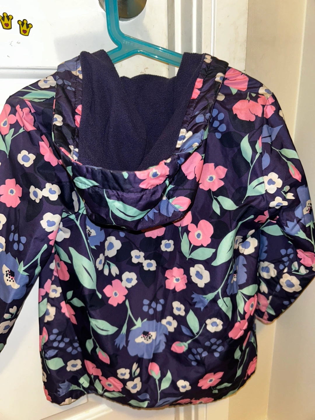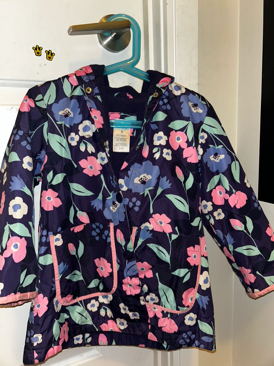 Navy background with floral print rain jacket with fleece lining. Features a hood and pockets. Zipper and button closure.