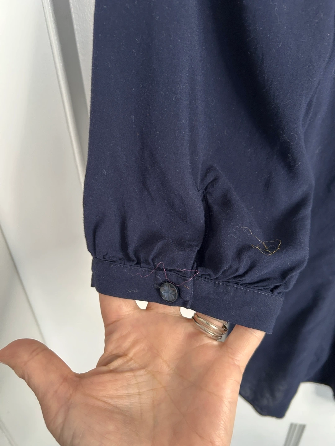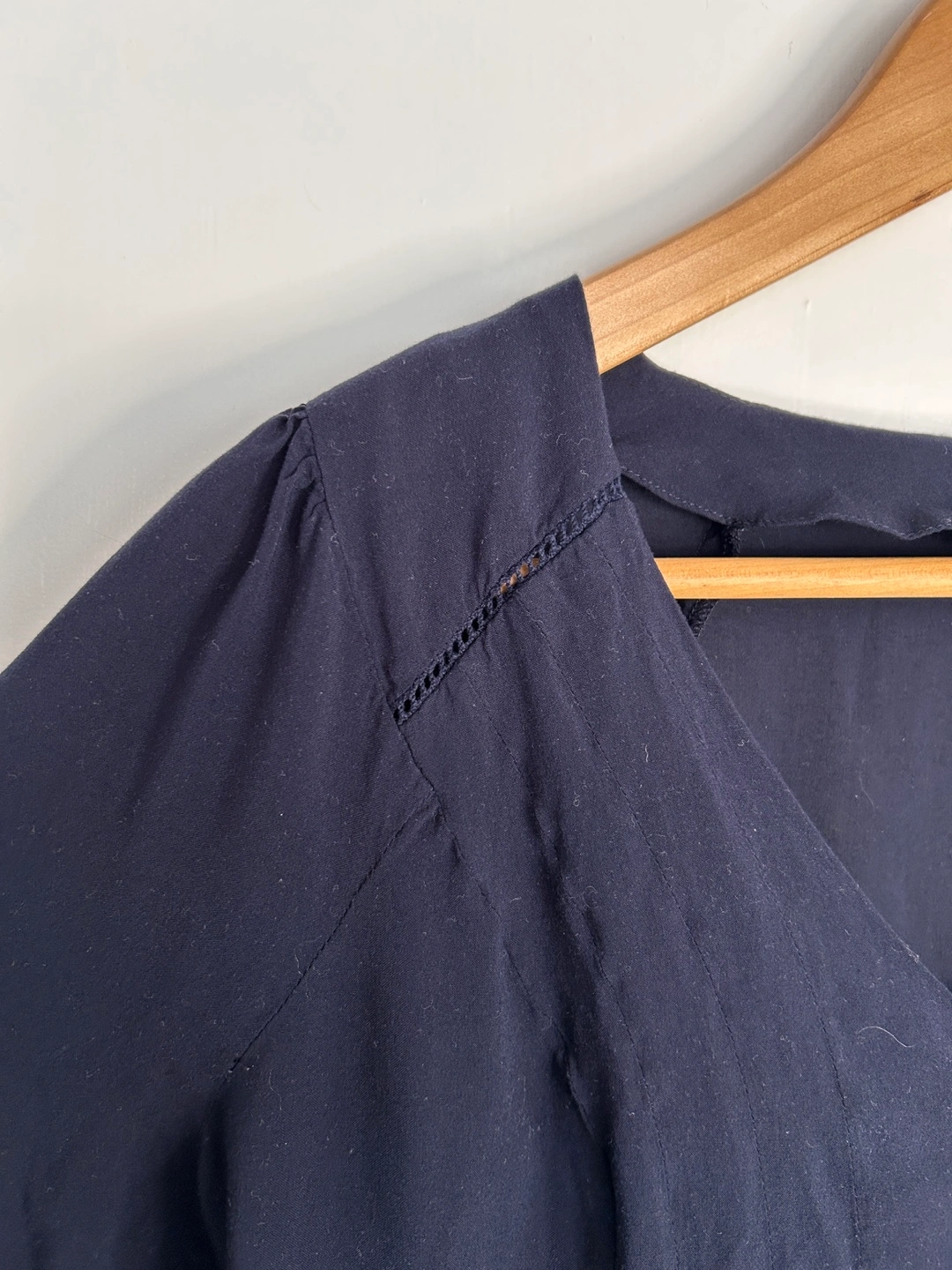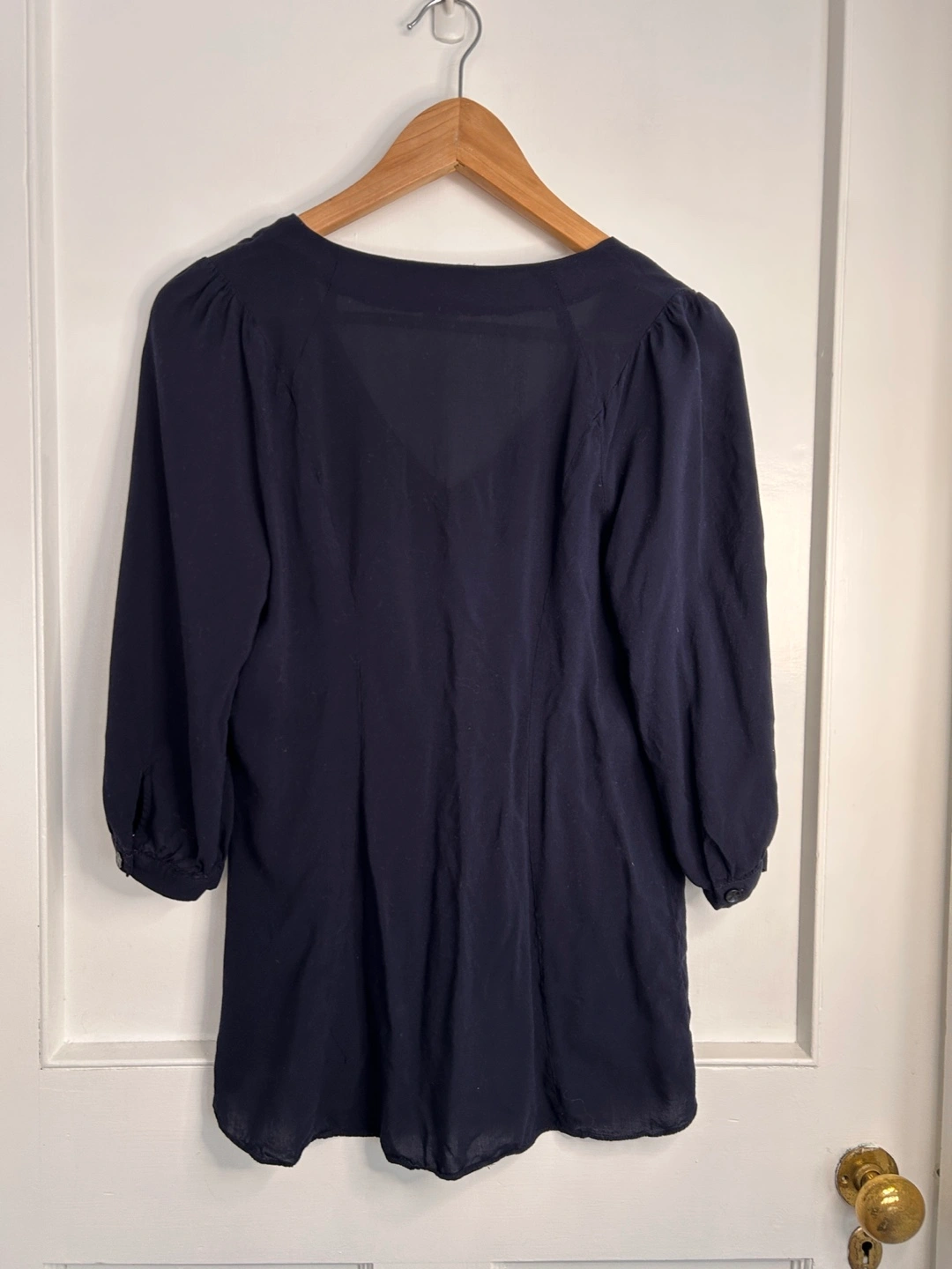 Navy blue V neck blouse that buttons up the front.