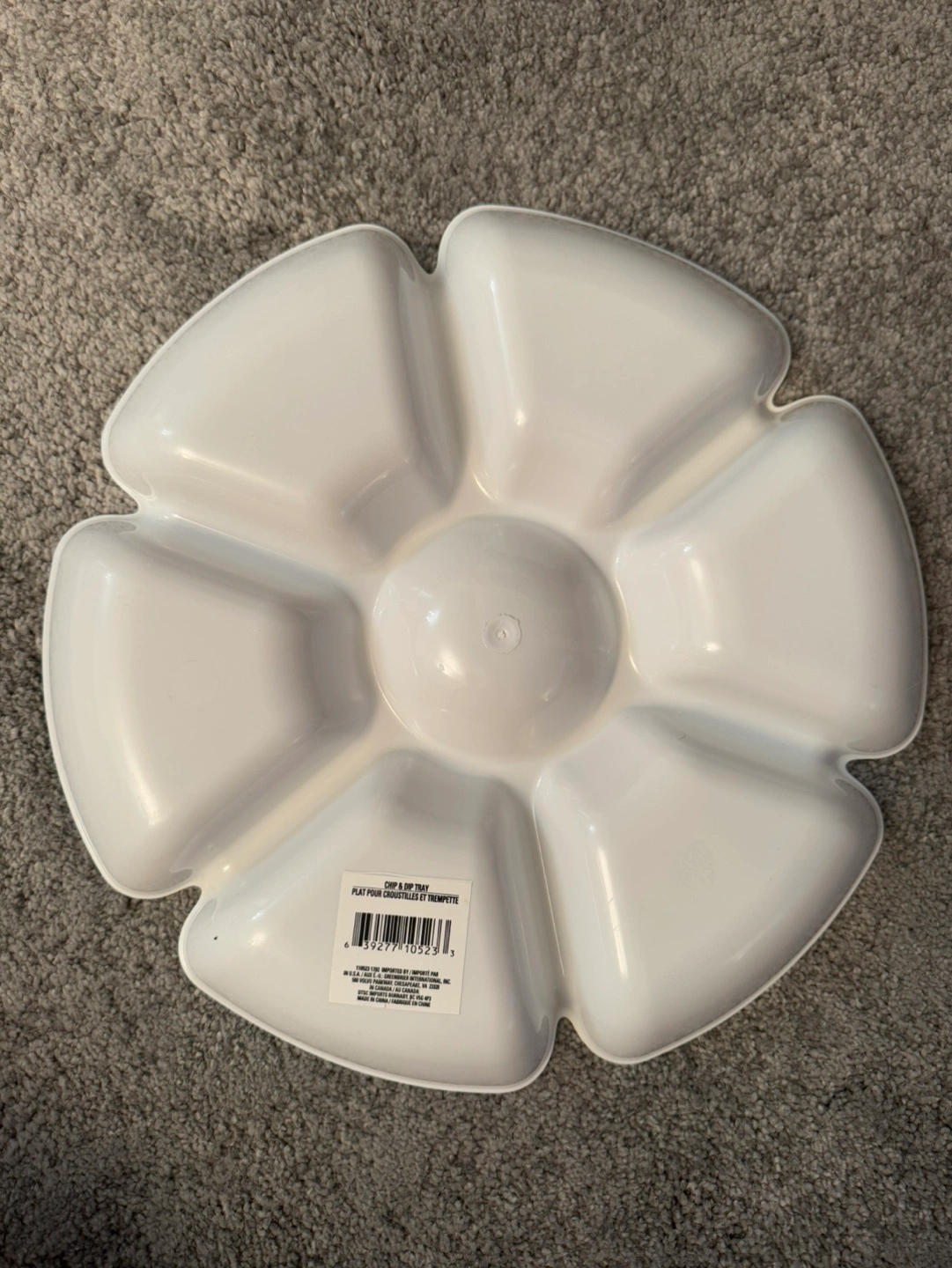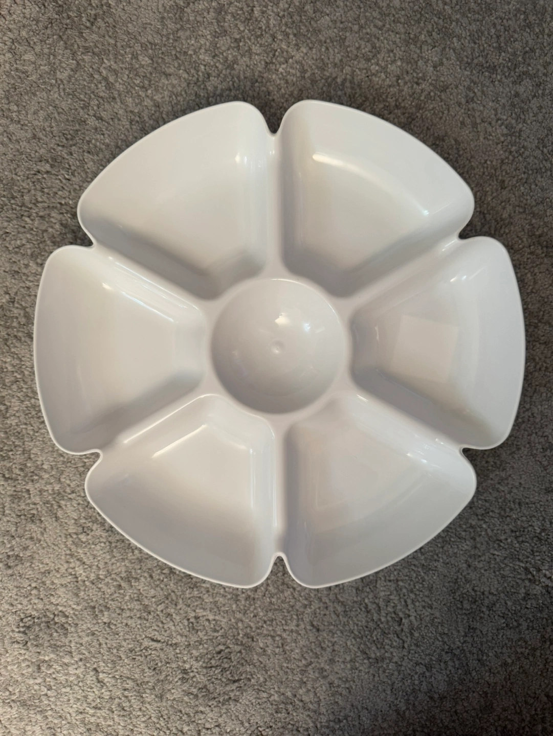 White plastic serving tray with six sections and a central dip bowl. Ideal for parties or snacks.