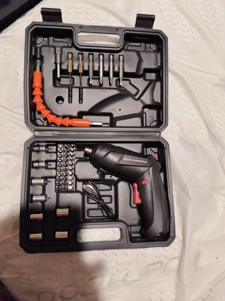 Electric screwdriver with carrying case, charging cord, flexible extension bit, various drill bits and screwdriver heads. 45+ piece set.
