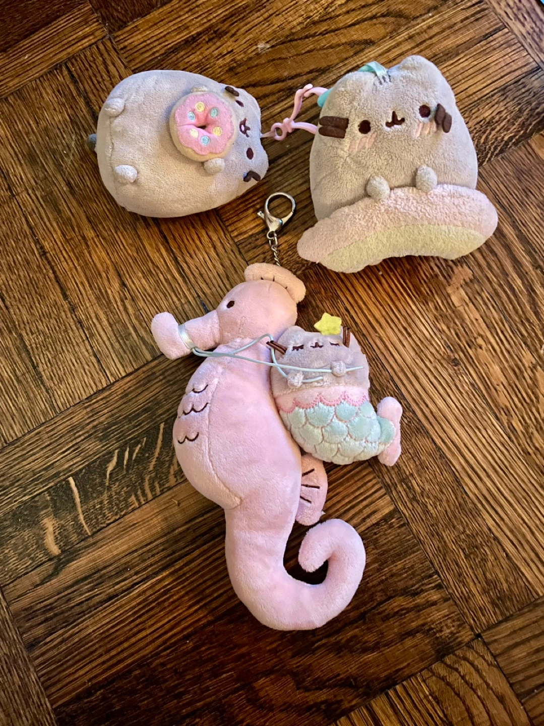 Set of 3 Pusheen plush keychains. Includes a donut Pusheen, a mermaid Pusheen, and a Pusheen riding seahorse