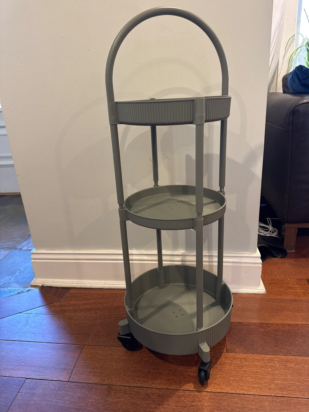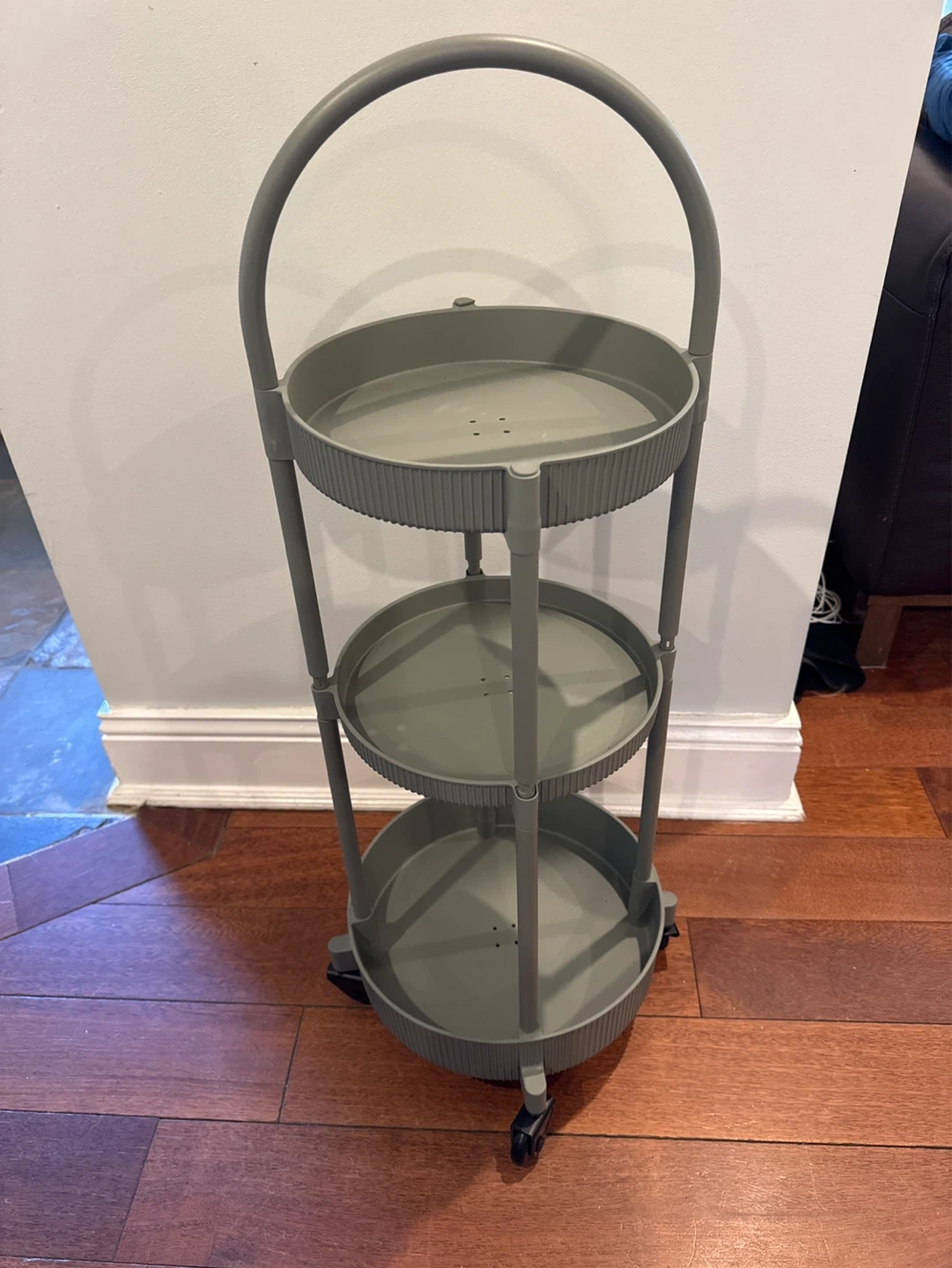Assembled and never used. This grey green three-tier rolling storage cart is great for organizing any space! It's made of plastic and has a convenient handle and wheels for easy movement. Perfect for craft supplies, bathroom essentials, or kitchen organization.