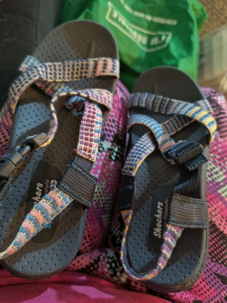 Women's sandals, size 8, multi-coloured, with adjustable straps.