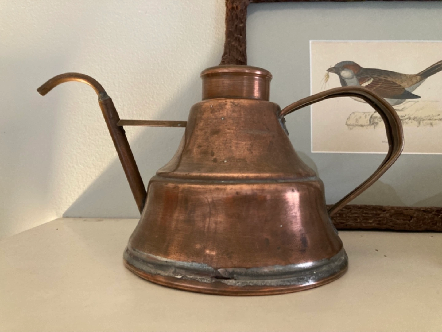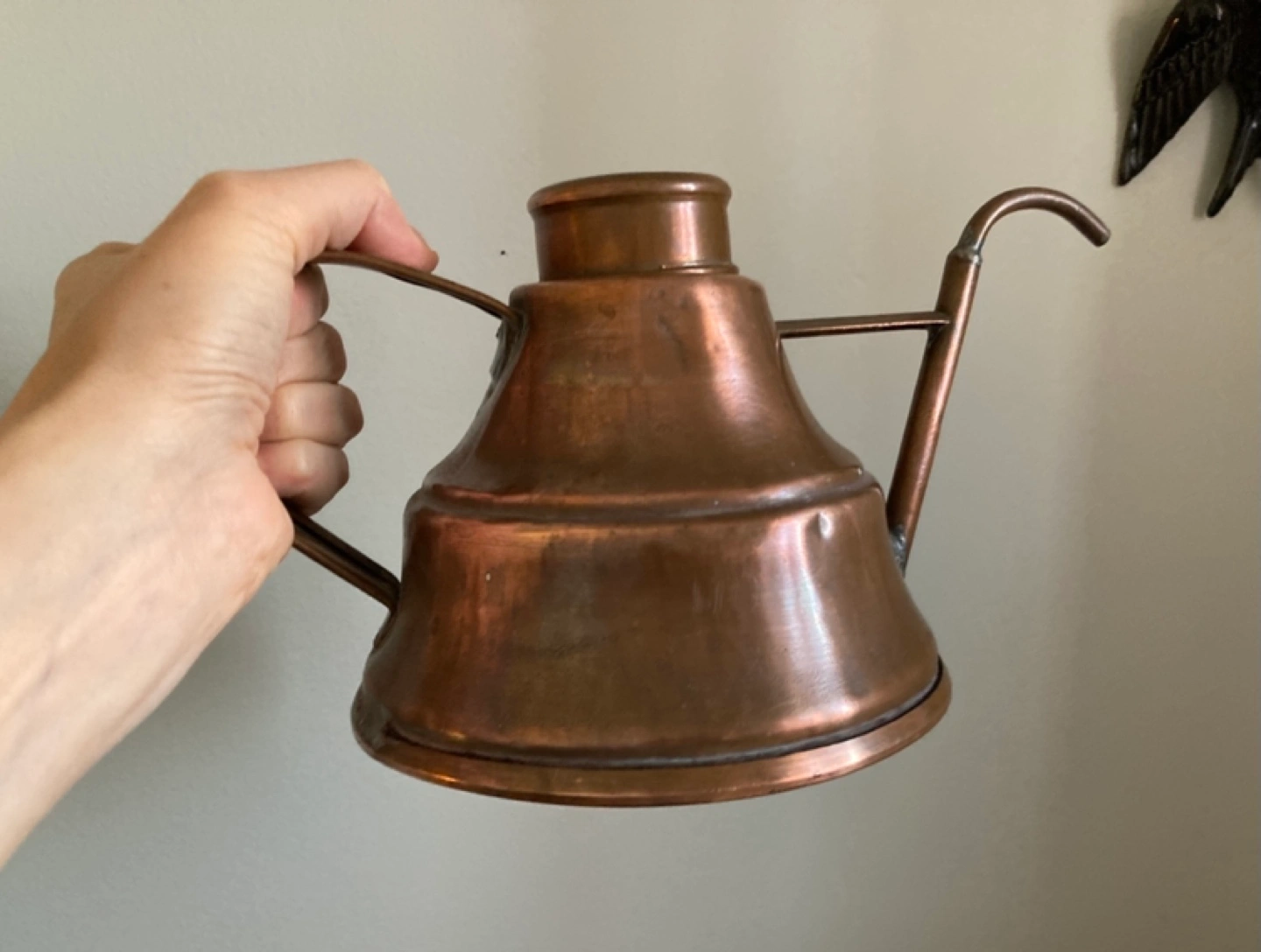Vintage copper watering can. It has a great look and would be a cool decor piece. It’s not marked so I am not sure the age but it looks quite old and antique. Features a long spout and curved handle. Shows signs of age and wear. Has a lid but it’s missing the handle it once had. Great as decor, I can’t vouch for how useful it would be as a watering can, it’s pretty old and the inside is quite oxidized. Pickup in the ossington and Davenport area.