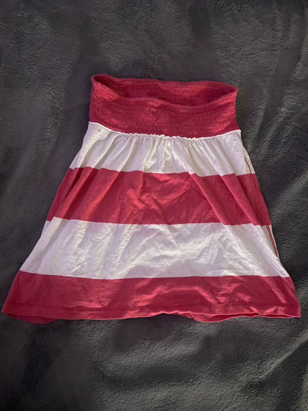 Women's size medium tube top. Red and white horizontal stripes. Elastic waistband. Made in Vietnam.