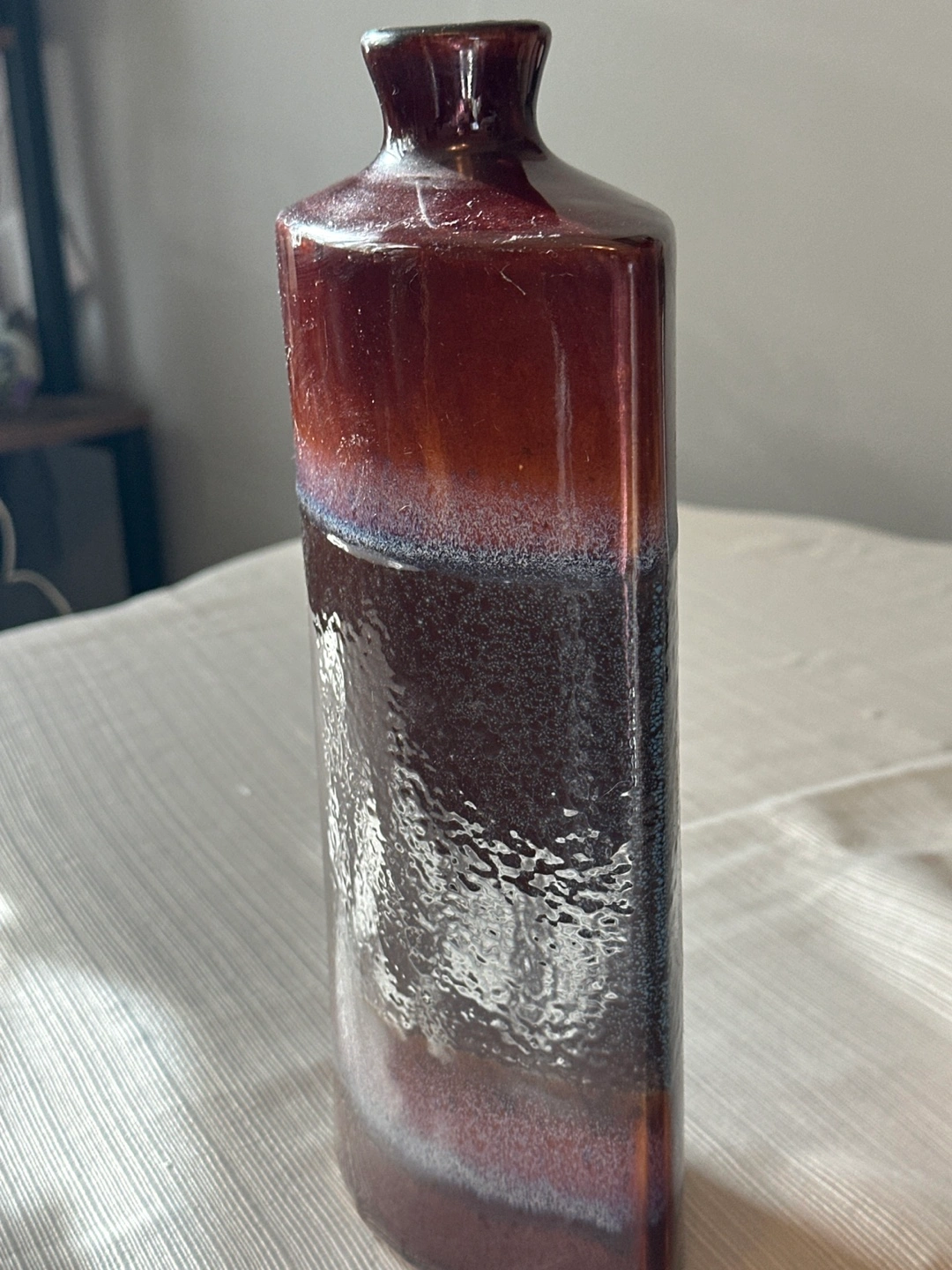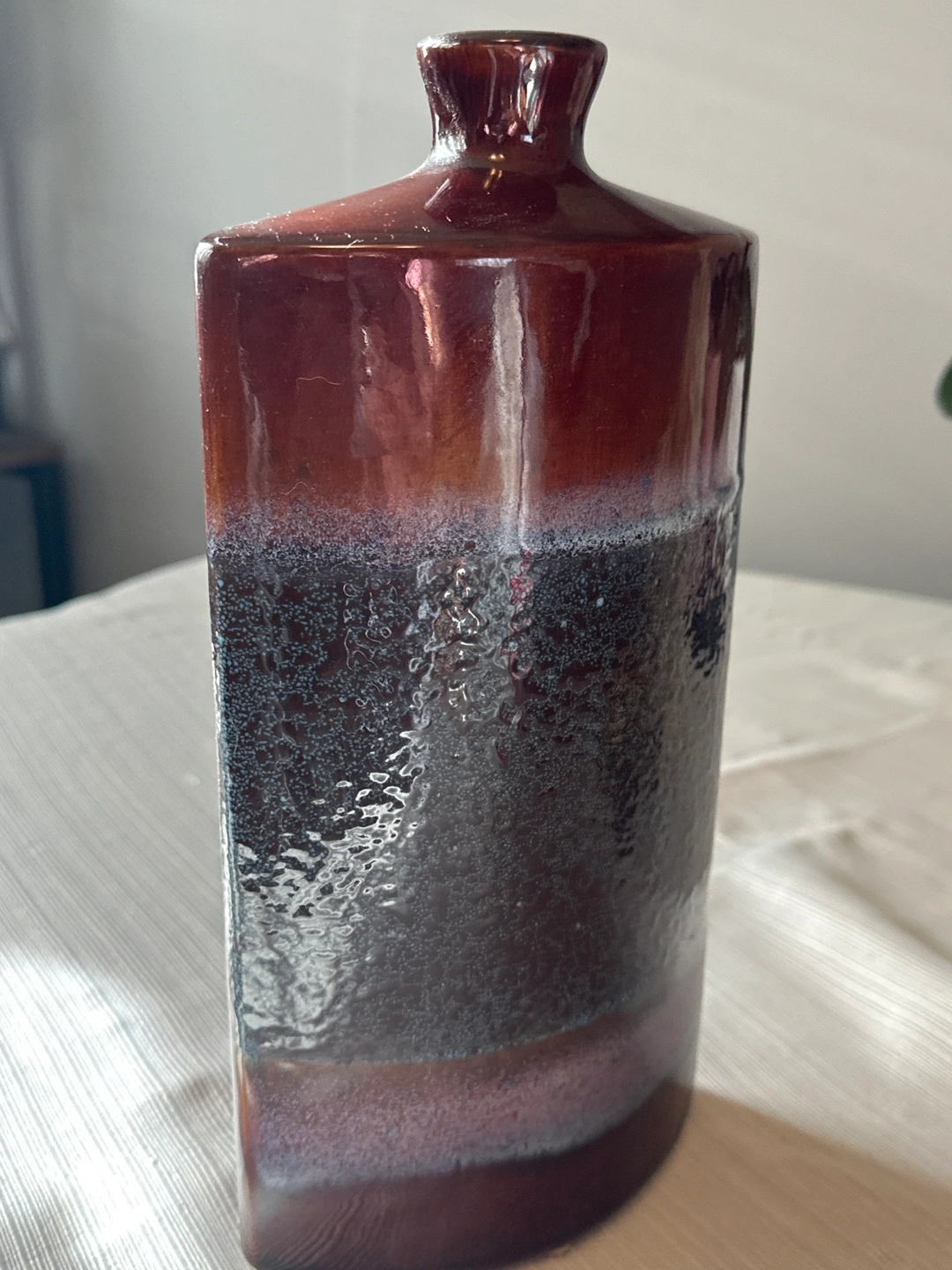Unique dark brown ceramic vase. Features a textured, mottled glaze. Rectangular shape with a slight curve. Perfect for a modern or eclectic home decor.