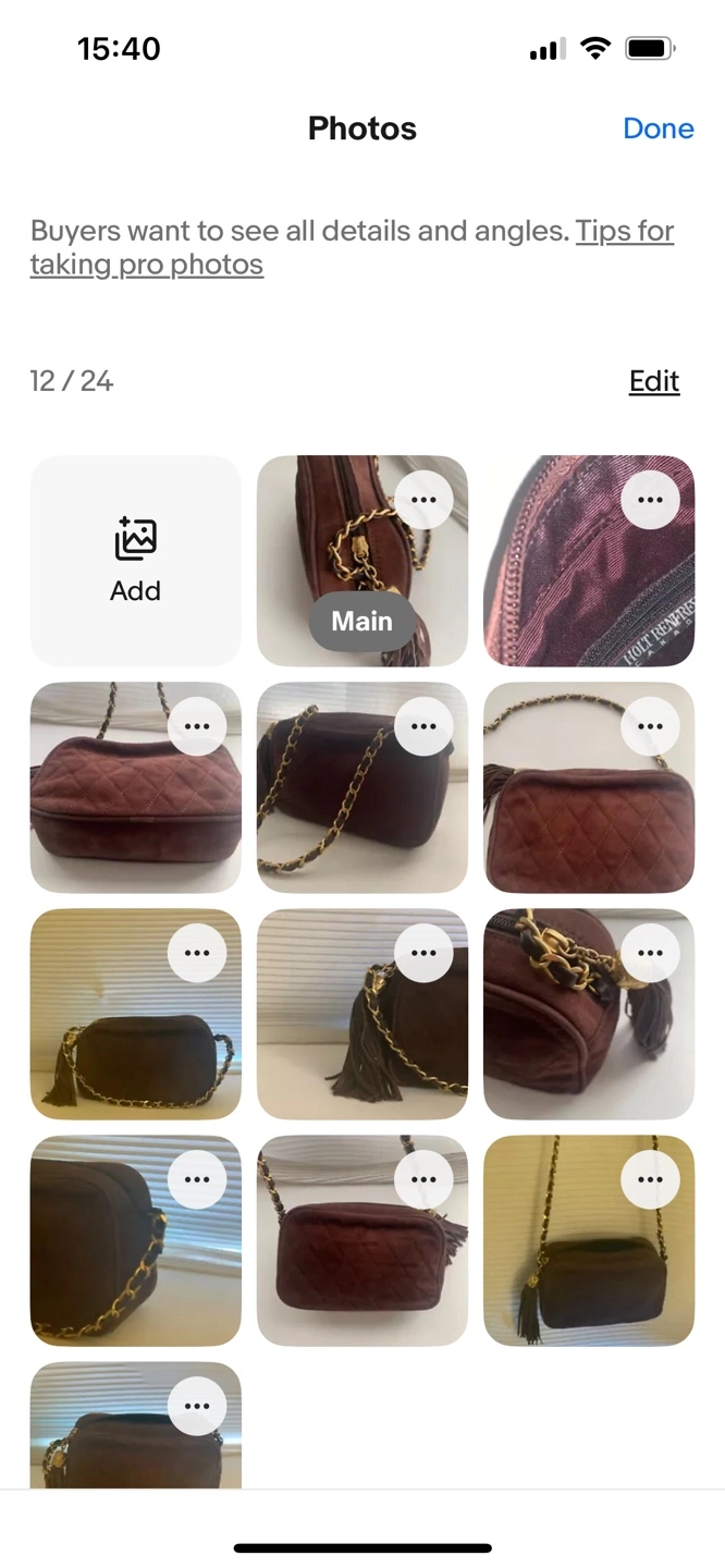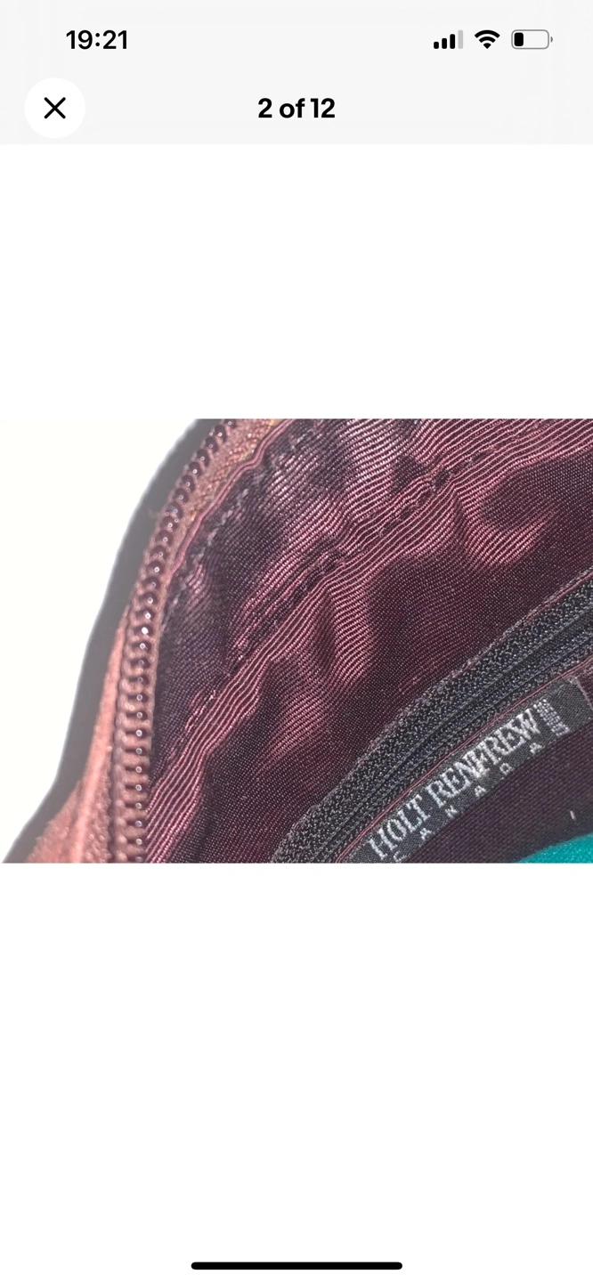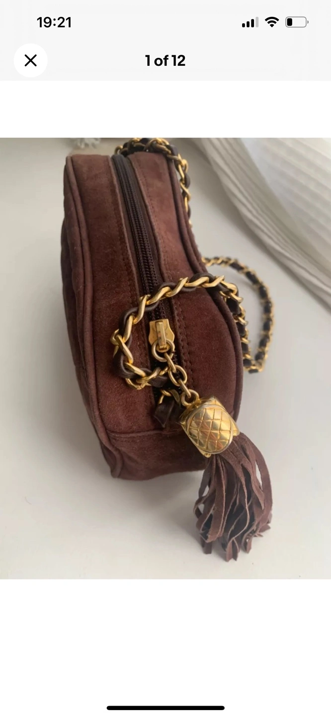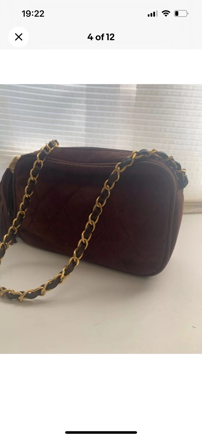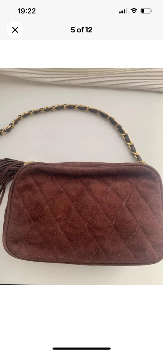 Italian vintage camera bag brown suede cushion with gold link chain leather strap. Measures 7” x 6” and 3 inches deep. Zipper closure with inner pocket