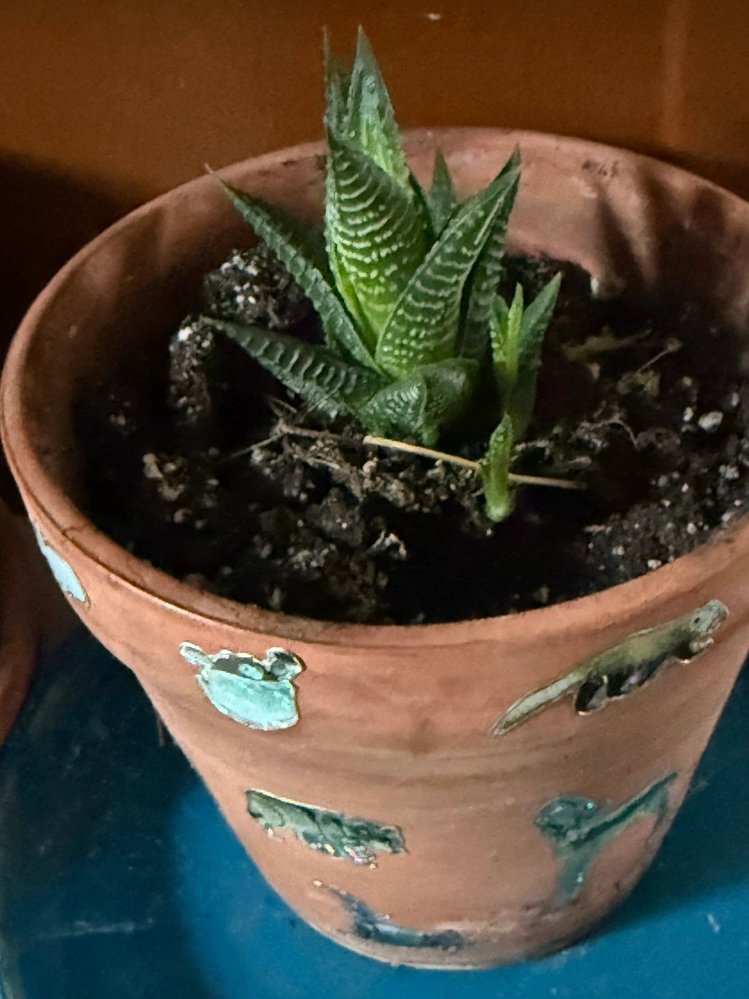 Small Haworthia Attenuata succulent in a terracotta pot. Pot decorated with small animal stickers. Great addition to any plant collection.